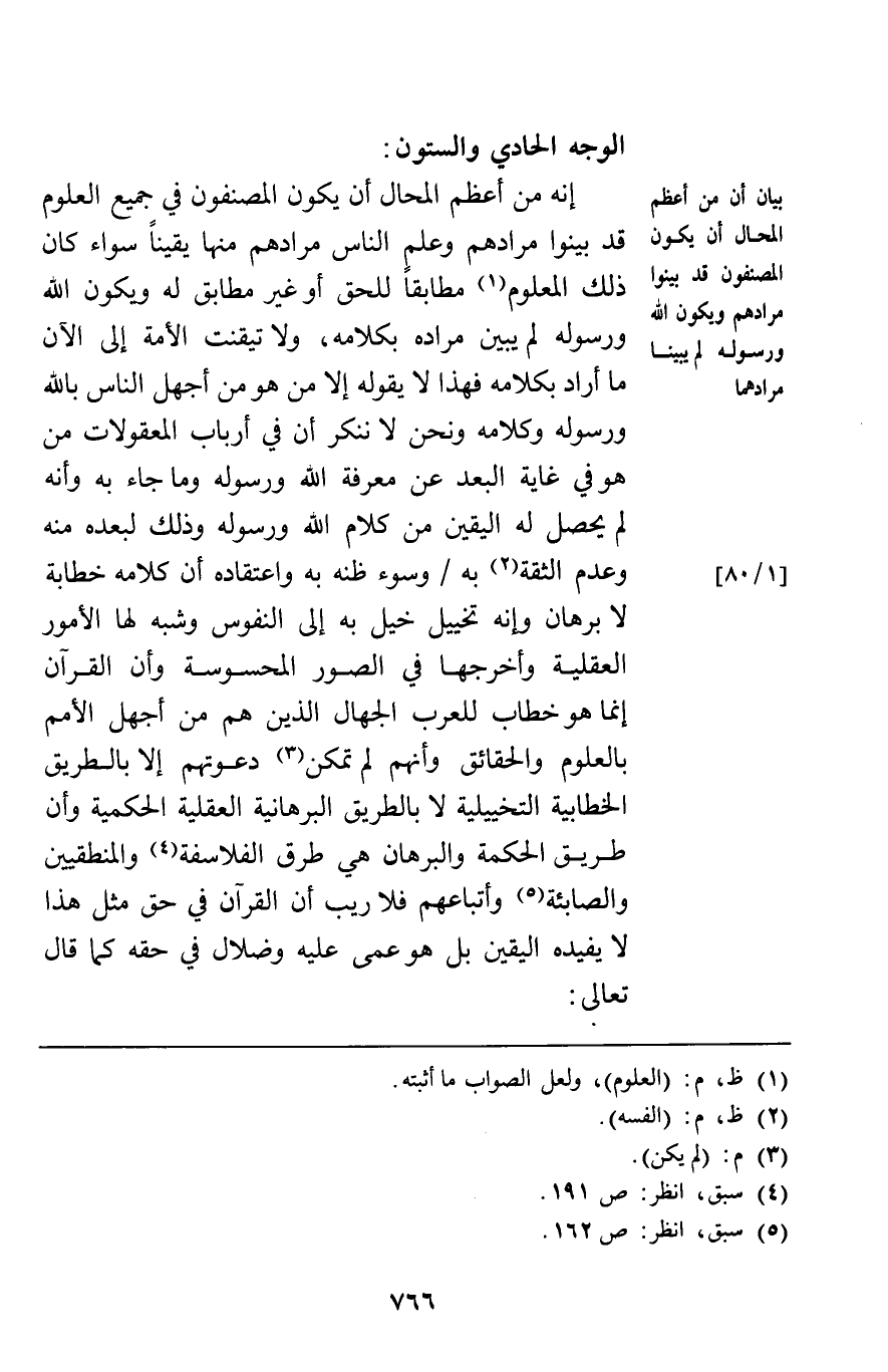 الوجه الحادي والستون إنه من أعظم المحال أن يكون المصنفون في جميع العلوم قد بينوا مرادهم وعلم الناس مرادهم منها يقينا سواء كان ذلك المعلوم مطابقا للحق أو غير مطابق له ويكون الله ورسوله لم يبين مراده بكلامه ولا تيقنت الأمة إلى الآن ما أراد بكلامه فهذا لا يقوله إلا من هو من أجهل الناس بالله ورسوله وكلامه ونحن لا ننكر أن في أرباب المعقولات من هو في غاية البعد عن معرفة الله ورسوله وما جاء به وأنه لم يحصل له اليقين من كلام الله ورسوله وذلك لبعده منه وعدم الثقة به وسوء ظنه به واعتقاده أن كلامه خطابة لا برهان وإنه تخييل خيل به إلى النفوس وشبه لها الأمور العقلية وأخرجها في الصور المحسوسة وأن القرآن إنما هو خطاب للعرب الجهال الذين هم من أجهل الأمم بالعلوم والحقائق وأنهم لم تمكن دعوتهم إلا بالطريق الخطابية التخييلية لا بالطريق البرهانية العقلية الحكمية وأن طريق الحكمة والبرهان هي طرق الفلاسفة والمنطقيين والصابئة وأتباعهم فلا ريب أن القرآن في حق مثل هذا لا يفيده اليقين بل هو عمى عليه وضلال في حقه كما قال تعالى:
