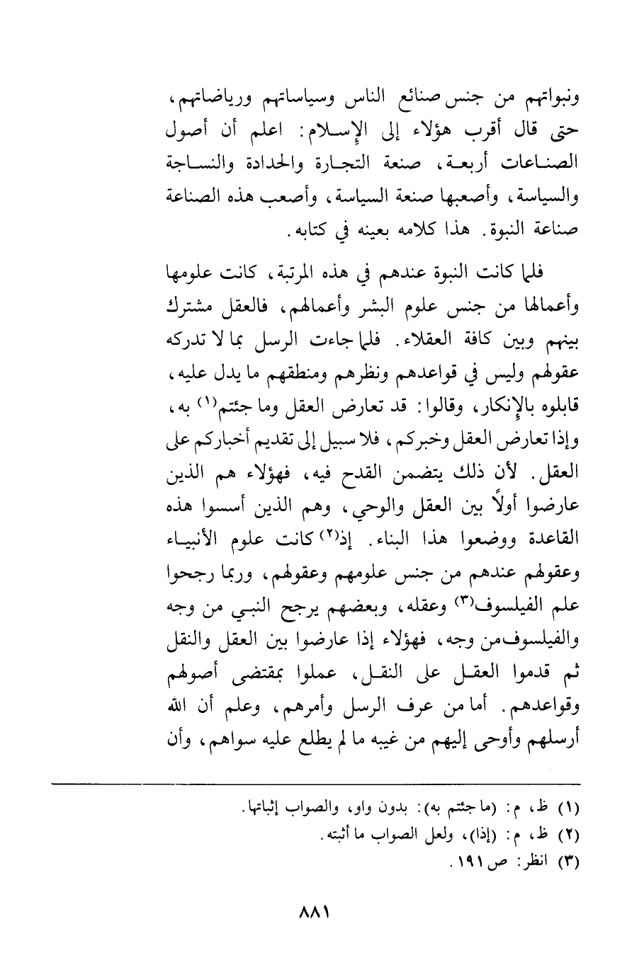 ونبواتهم من جنس صنائع الناس وسياساتهم ورياضاتهم حتى قال أقرب هؤلاء إلى الإسلام اعلم أن أصول الصناعات أربعة صنعة التجارة والحدادة والنساجة والسياسة وأصعبها صنعة السياسة وأصعب هذه الصناعة صناعة النبوة هذا كلامه بعينه في كتابه.