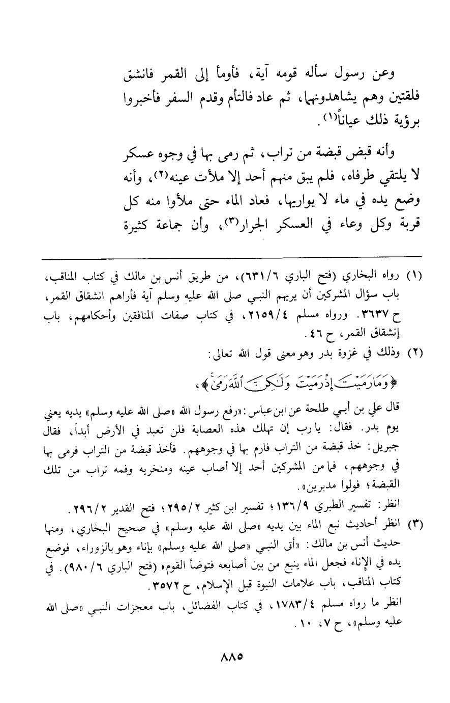 وأنه قبض قبضة من تراب ثم رمى بها في وجوه عسكر لا يلتقي طرفاه فلم يبق منهم أحد إلا ملأت عينه وأنه وضع يده في ماء لا يواريها فعاد الماء حتى ملأوا منه كل قربة وكل وعاء في العسكر الجرار وأن جماعة كثيرة
