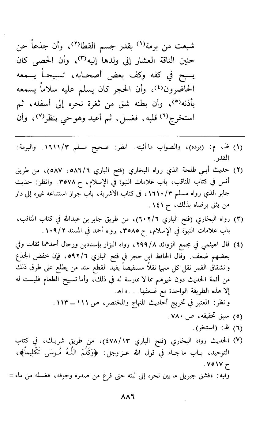 شبعت من برمة بقدر جسم القطا وأن جذعا حن حنين الناقة العشار إلى ولدها إليه وأن الحصى كان يسبح في كفه وكف بعض أصحابه تسبيحا يسمعه الحاضرون وأن الحجر كان يسلم عليه سلاما يسمعه بأذنه وأن بطنه شق من ثغرة نحره إلى أسفله ثم استخرج قلبه فغسل ثم أعيد وهو حي ينظر وأن
