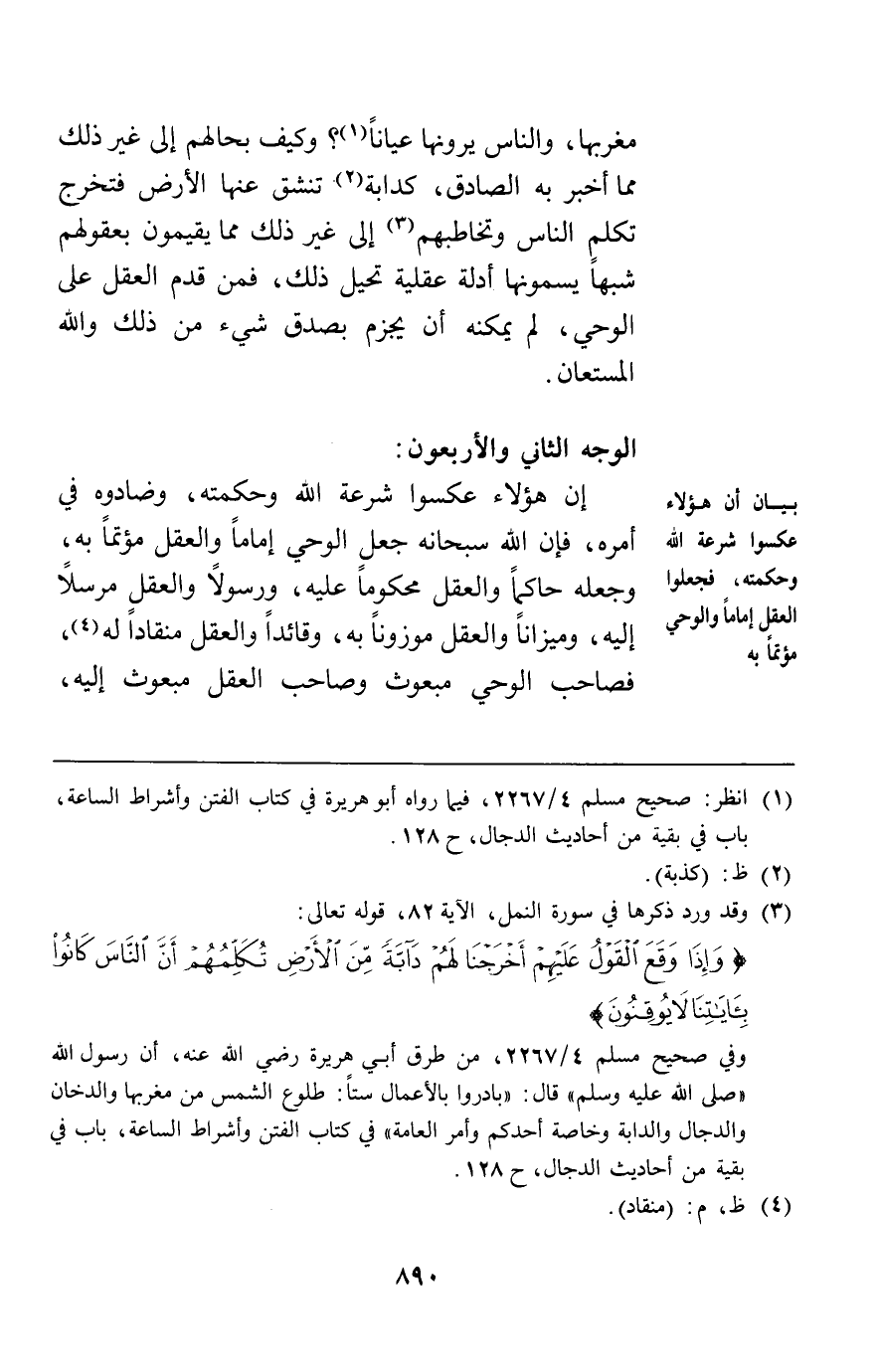 مغربها والناس يرونها عيانا وكيف بحالهم إلى غير ذلك مما أخبر به الصادق كدابة تنشق عنها الأرض فتخرج تكلم الناس وتخاطبهم إلى غير ذلك مما يقيمون بعقولهم شبها يسمونها أدلة عقلية تحيل ذلك فمن قدم العقل على الوحي لم يمكنه أن يجزم بصدق شيء من ذلك والله المستعان.