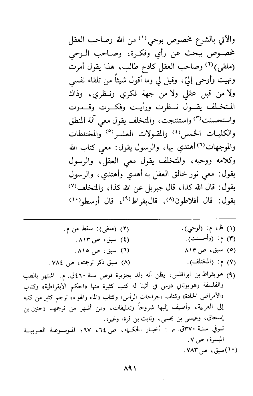 والآتي بالشرع مخصوص بوحي من الله وصاحب العقل مخصوص ببحث عن رأي وفكرة وصاحب الوحي ملقى وصاحب العقل كادح طالب هذا يقول أمرت ونهيت وأوحى إلي وقيل لي وما أقول شيئا من تلقاء نفسي ولا من قبل عقلي ولا من جهة فكري ونظري وذاك المتخلف يقول نظرت ورأيت وفكرت وقدرت واستحسنت واستنتجت والمتخلف يقول معي آلة المنطق والكليات الخمس والمقولات العشر والمختلطات والموجهات أهتدي بها والرسول يقول معي كتاب الله وكلامه ووحيه والمتخلف يقول معي العقل والرسول يقول معي نور خالق العقل به أهدي وأهتدي والرسول يقول قال الله كذا قال جبريل عن الله كذا والمتخلف يقول قال أفلاطون قال بقراط قال أرسطو