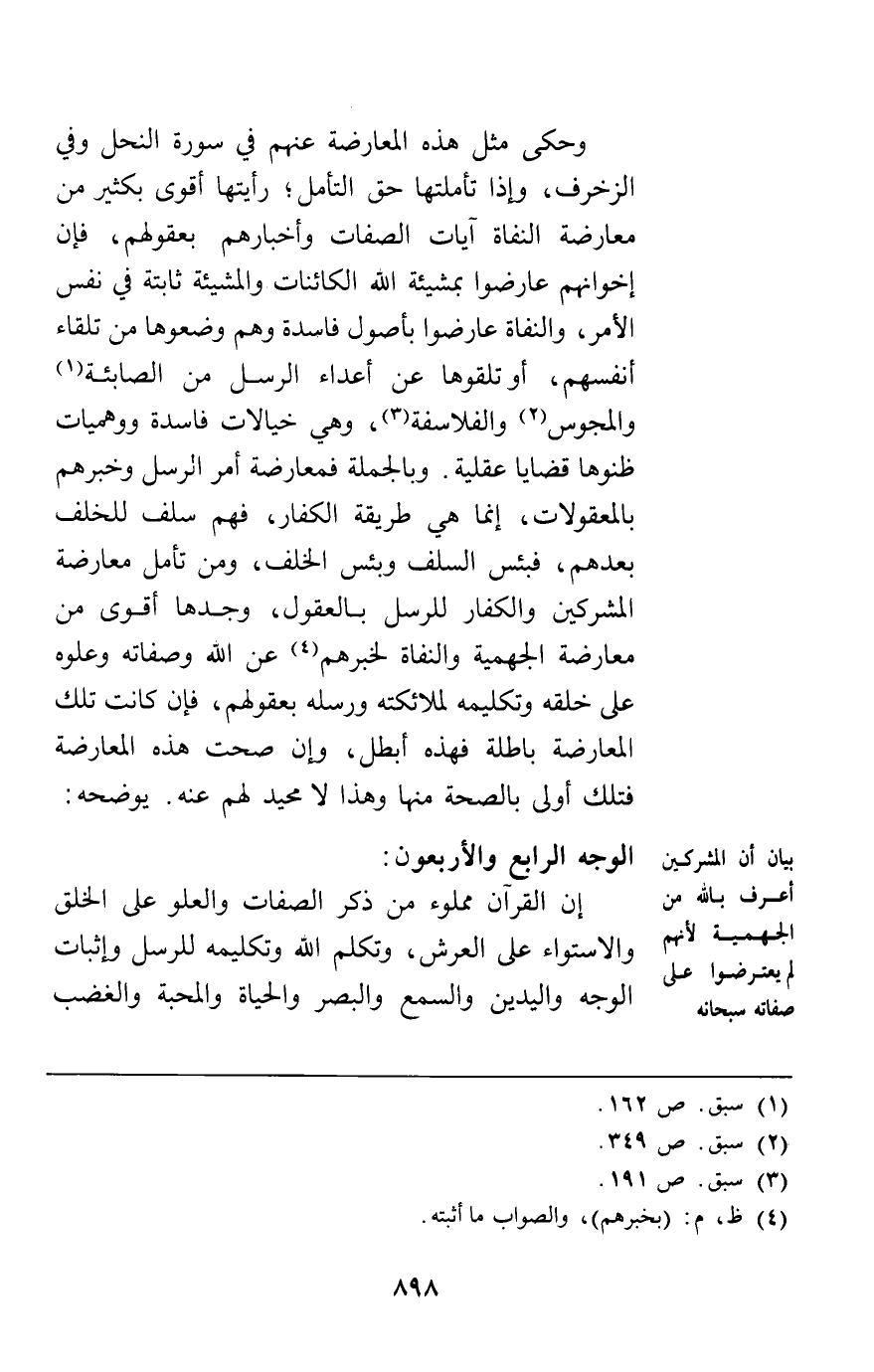 الوجه الرابع والأربعون: إن القرآن مملوء من ذكر الصفات والعلو على الخلق والاستواء على العرش وتكلم الله وتكليمه للرسل وإثبات الوجه واليدين والسمع والبصر والحياة والمحبة والغضب