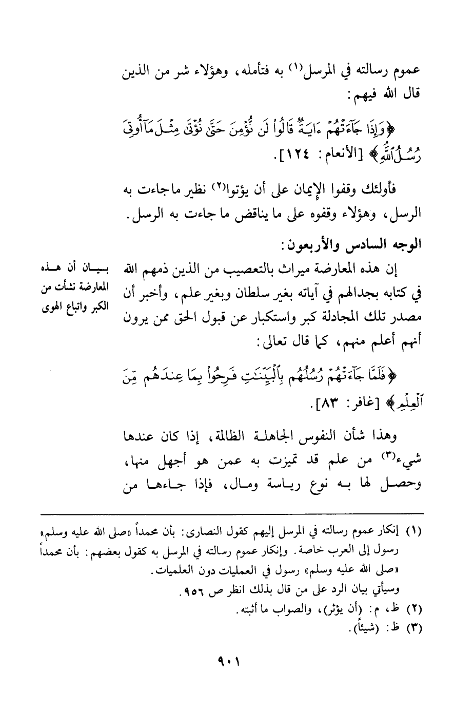 عموم رسالته في المرسل به فتأمله وهؤلاء شر من الذين قال الله فيهم {وَإِذَا جَاءَتْهُمْ آيَةٌ قَالُوا لَنْ نُؤْمِنَ حَتَّى نُؤْتَى مِثْلَ مَا أُوتِيَ رُسُلُ اللَّهِ} [الأنعام124] فأولئك وقفوا الإيمان على أن يؤتوا نظير ما جاءت به الرسل وهؤلاء وقفوه على ما يناقض ما جاءت به الرسل.