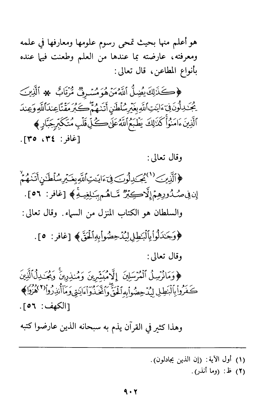 هو أعلم منها بحيث تمحى رسوم علومها ومعارفها في علمه ومعرفته عارضته بما عندها من العلم وطعنت فيما عنده بأنواع المطاعن قال تعالى {كَذَلِكَ يُضِلُّ اللَّهُ مَنْ هُوَ مُسْرِفٌ مُرْتَابٌ الَّذِينَ يُجَادِلُونَ فِي آيَاتِ اللَّهِ بِغَيْرِ سُلْطَانٍ أَتَاهُمْ كَبُرَ مَقْتاً عِنْدَ اللَّهِ وَعِنْدَ الَّذِينَ آمَنُوا كَذَلِكَ يَطْبَعُ اللَّهُ عَلَى كُلِّ قَلْبِ مُتَكَبِّرٍ جَبَّارٍ} [غافر35 , 34] وقال تعالى {إِنَّ الَّذِينَ يُجَادِلُونَ فِي آيَاتِ اللَّهِ بِغَيْرِ سُلْطَانٍ أَتَاهُمْ إِنْ فِي صُدُورِهِمْ إِلاَّ كِبْرٌ مَا هُمْ بِبَالِغِيهِ} [غافر56] والسلطان هو الكتاب المنزل من السماء وقال تعالى {وَجَادَلُوا بِالْبَاطِلِ لِيُدْحِضُوا بِهِ الْحَقّ} [غافر5] وقال تعالى {وَمَا نُرْسِلُ الْمُرْسَلِينَ إِلاَّ مُبَشِّرِينَ وَمُنْذِرِينَ وَيُجَادِلُ الَّذِينَ كَفَرُوا بِالْبَاطِلِ لِيُدْحِضُوا بِهِ الْحَقَّ وَاتَّخَذُوا آيَاتِي وَمَا أُنْذِرُوا هُزُواً} [الكهف56] وهذا كثير في القرآن يذم به سبحانه الذين عارضوا كتبه