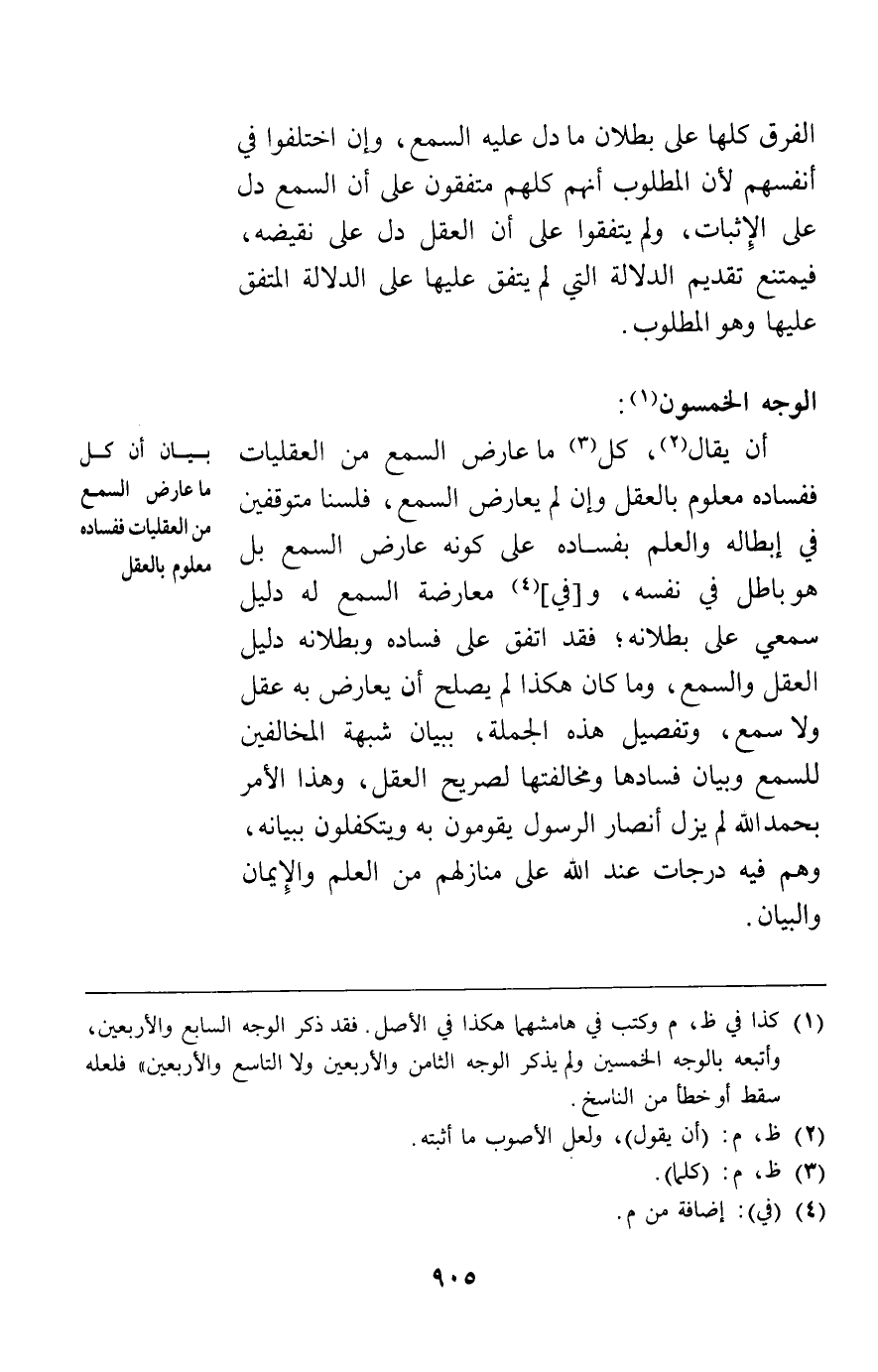 الوجه الخمسون1: أن يقال كل ما عارض السمع من العقليات ففساده معلوم بالعقل وإن لم يعارض السمع فلسنا متوقفين في إبطاله والعلم بفساده على كونه عارض السمع بل هو باطل في نفسه وفي معارضة السمع له دليل سمعي على بطلانه فقد اتفق على فساده وبطلانه دليل العقل والسمع وما كان هكذا لم يصلح أن يعارض به عقل ولا سمع وتفصيل هذه الجملة ببيان شبهة المخالفين للسمع وبيان فسادها ومخالفتها لصريح العقل وهذا الأمر بحمد الله لم يزل أنصار الرسول يقومون به ويتكفلون ببيانه وهم فيه درجات عند الله على منازلهم من العلم والإيمان والبيان.
