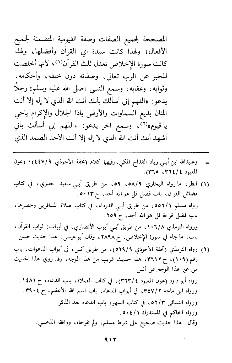 المصححة لجميع الصفات وصفة القيومية المتضمنة لجميع الأفعال ولهذا كانت سيدة آي القرآن وأفضلها ولهذا كانت سورة الإخلاص تعدل ثلث القرآن لأنها أخلصت للخبر عن الرب تعالى وصفاته دون خلقه وأحكامه وثوابه وعقابه وسمع النبي صلى الله عليه وسلم رجلا يدعو "اللهم إني أسألك بأنك أنت الله الذي لا إله إلا أنت المنان بديع السماوات والأرض ياذا الجلال والإكرام يا حي يا قيوم " وسمع آخر يدعو "اللهم إني أسألك بأني أشهد أنك أنت الله الذي لا إله إلا أنت الأحد الصمد الذي