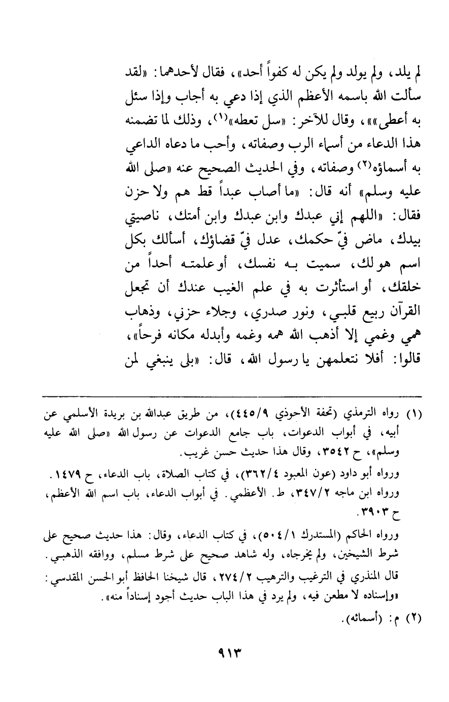 لم يلد ولم يولد ولم يكن له كفوا أحد" فقال لأحدهما "لقد سألت الله باسمه الأعظم الذي إذا دعي به أجاب وإذا سئل به أعطى " وقال للآخر "سل تعطه" وذلك لما تضمنه هذا الدعاء من أسماء الرب وصفاته وأحب ما دعاه الداعي به أسماؤه وصفاته وفي الحديث الصحيح عنه أنه قال صلى الله عليه وسلم: " ما أصاب عبدا قط هم ولا حزن فقال اللهم إني عبدك وابن عبدك وابن أمتك ناصيتي بيدك ماض في حكمك عدل في قضاؤك أسألك بكل اسم هو لك سميت به نفسك أو علمته أحدا من خلقك أو استأثرت به في علم الغيب عندك أن تجعل القرآن ربيع قلبي ونور صدري وجلاء حزني وذهاب همي وغمي إلا أذهب الله همه وغمه وأبدله مكانه فرحا" قالوا أفلا نتعلمهن يا رسول الله قال "بلى ينبغي لمن