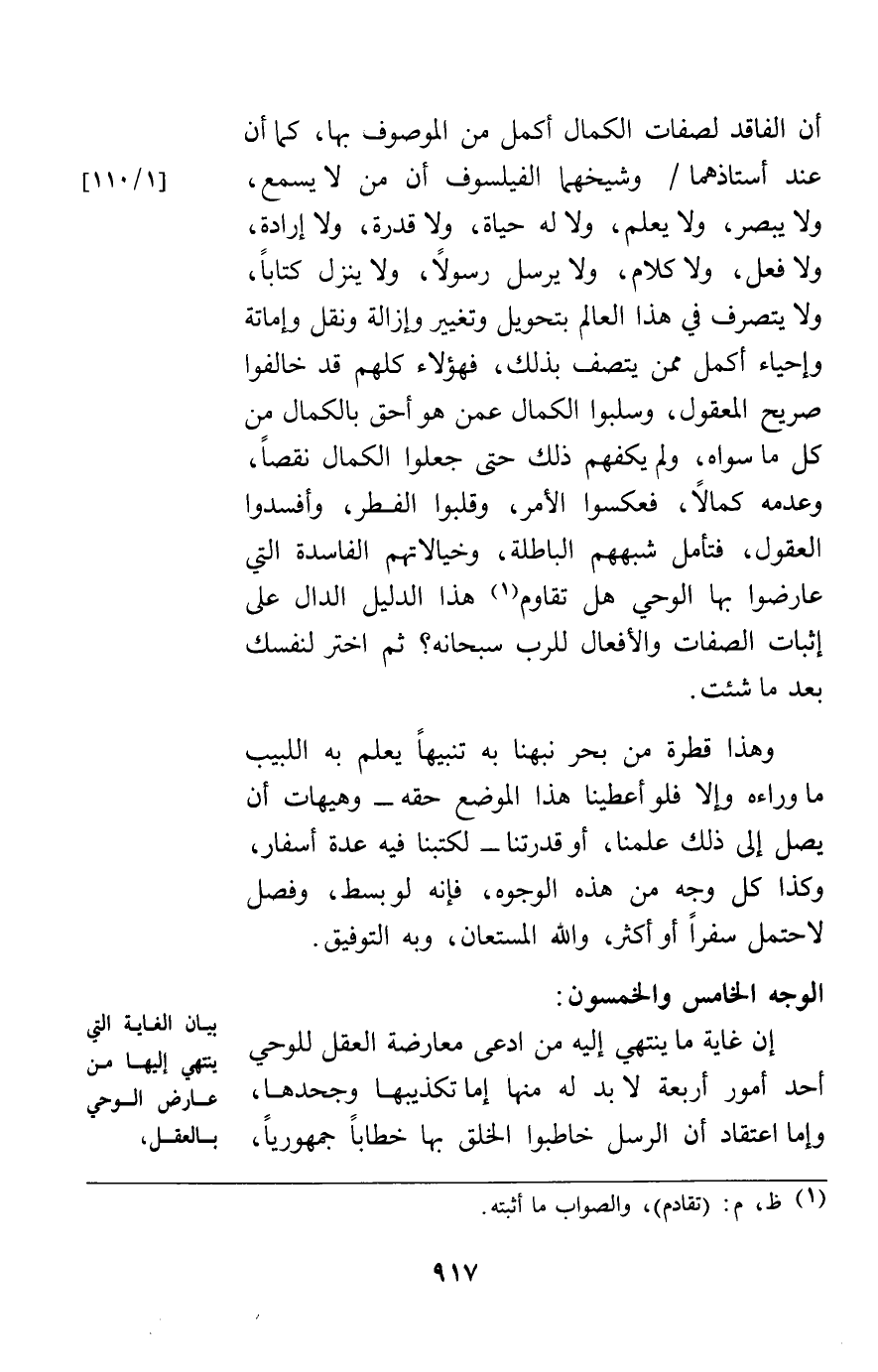 أن الفاقد لصفات الكمال أكمل من الموصوف بها كما أن عند أستاذهما وشيخهما الفيلسوف أن من لا يسمع ولا يبصر ولا يعلم ولا له حياة ولا قدرة ولا إرادة ولا فعل ولا كلام ولا يرسل رسولا ولا ينزل كتابا ولا يتصرف في هذا العالم بتحويل وتغيير وإزالة ونقل وإماتة وإحياء أكمل ممن يتصف بذلك فهؤلاء كلهم قد خالفوا صريح المعقول وسلبوا الكمال عمن هو أحق بالكمال من كل ما سواه ولم يكفهم ذلك حتى جعلوا الكمال نقصا وعدمه كمالا فعكسوا الأمر وقلبوا الفطر وأفسدوا العقول فتأمل شبههم الباطلة وخيالاتهم الفاسدة التي عارضوا بها الوحي هل تقاوم هذا الدليل الدال على إثبات الصفات والأفعال للرب سبحانه ثم اختر لنفسك بعد ما شئت.