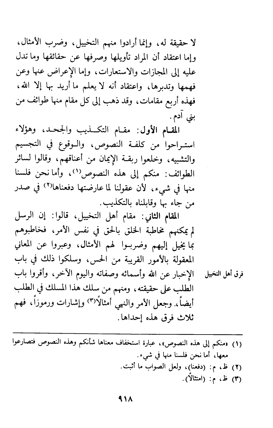 المقام الثاني: مقام أهل التخييل قالوا إن الرسل لم يمكنهم مخاطبة الخلق بالحق في نفس الأمر فخاطبوهم بما يخيل إليهم وضربوا لهم الأمثال وعبروا عن المعاني المعقولة بالأمور القريبة من الحس وسلكوا ذلك في باب الإخبار عن الله وأسمائه وصفاته واليوم الاخر وأقروا باب الطلب على حقيقته ومنهم من سلك هذا المسلك في الطلب أيضا وجعل الأمر والنهي أمثالا وإشارات ورموزا فهم ثلاث فرق هذه إحداها.