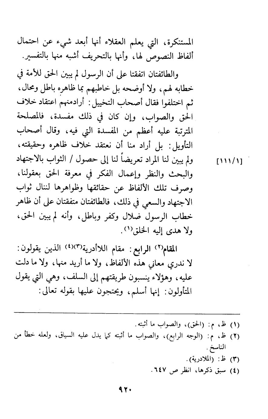 المقام الرابع: مقام اللاأدرية الذين يقولون لا ندري معاني هذه الألفاظ ولا ما أريد منها ولا ما دلت عليه وهؤلاء ينسبون طريقتهم إلى السلف وهي التي يقول المتأولون إنها أسلم ويحتجون عليها بقوله تعالى: