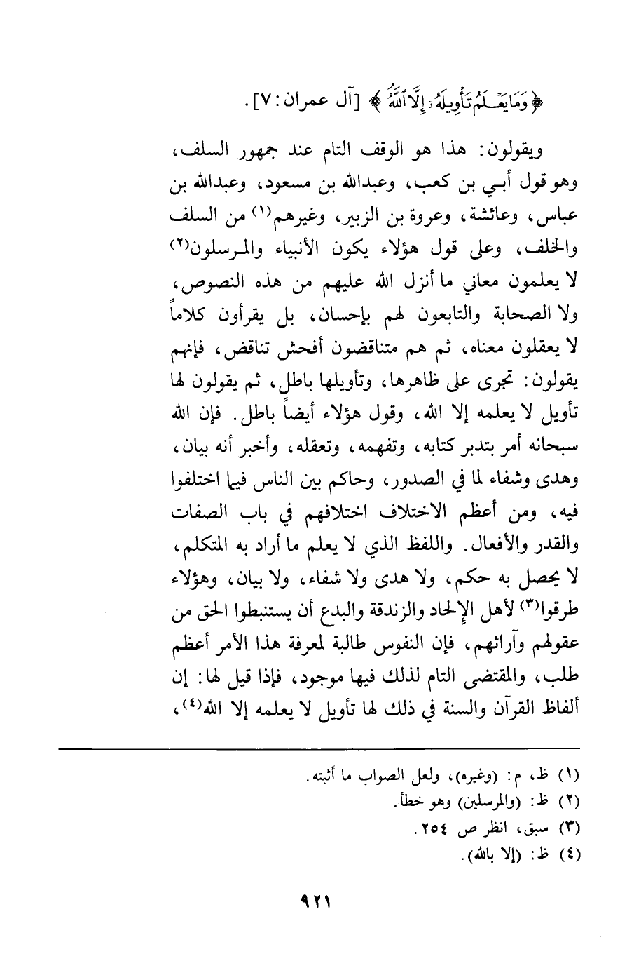 {وَمَا يَعْلَمُ تَأْوِيلَهُ إِلاَّ اللَّهُ} [آل عمران7] ويقولون هذا هو الوقف التام عند جمهور السلف وهو قول أبي بن كعب وعبد الله بن مسعود وعبد الله بن عباس وعائشة وعروة بن الزبير وغيرهم من السلف والخلف وعلى قول هؤلاء يكون الأنبياء والمرسلون لا يعلمون معاني ما أنزل الله عليهم من هذه النصوص ولا الصحابة والتابعون لهم بإحسان بل يقرأون كلاما لا يعقلون معناه ثم هم متناقضون أفحش تناقض فإنهم يقولون تجري على ظاهرها وتأويلها باطل ثم يقولون لها تأويل لا يعلمه إلا الله وقول هؤلاء أيضا باطل فإن الله سبحانه أمر بتدبر كتابه وتفهمه وتعقله وأخبر أنه بيان وهدى وشفاء لما في الصدور وحاكم بين الناس فيما اختلفوا فيه ومن أعظم الاختلاف اختلافهم في باب الصفات والقدر والأفعال واللفظ الذي لا يعلم ما أراد به المتكلم لا يحصل به حكم ولا هدى ولا شفاء ولا بيان وهؤلاء طرقوا لأهل الإلحاد والزندقة والبدع أن يستنبطوا الحق من عقولهم وآرائهم فإن النفوس طالبة لمعرفة هذا الأمر أعظم طلب والمقتضى التام لذلك فيها موجود فإذا قيل لها إن ألفاظ القرآن والسنة في ذلك لها تأويل لا يعلمه إلا الله