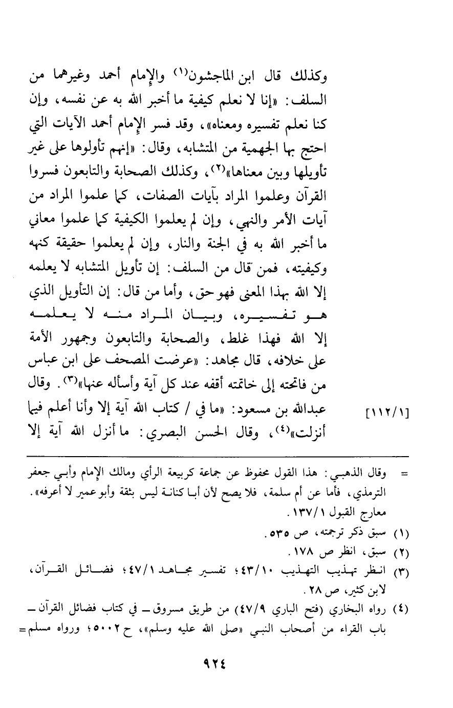 وكذلك قال ابن الماجشون والإمام أحمد وغيرهما من السلف إنا لا نعلم كيفية ما أخبر الله به عن نفسه وإن كنا نعلم تفسيره ومعناه وقد فسر الإمام أحمد الآيات التي احتج بها الجهمية من المتشابه وقال إنهم تأولوها على غير تأويلها وبين معناها وكذلك الصحابة والتابعون فسروا القرآن وعلموا المراد بآيات الصفات كما علموا المراد من آيات الأمر والنهي وإن لم يعلموا الكيفية كما علموا معاني ما أخبر الله به في الجنة والنار وإن لم يعلموا حقيقة كنهه وكيفيته فمن قال من السلف إن تأويل المتشابه لا يعلمه إلا الله بهذا المعنى فهو حق وأما من قال إن التأويل الذي هو تفسيره وبيان المراد منه لا يعلمه إلا الله فهذا غلط والصحابة والتابعون وجمهور الأمة على خلافه قال مجاهد عرضت المصحف على ابن عباس من فاتحته إلى خاتمته أقفه عند كل آية وأسأله عنها وقال عبد الله بن مسعود ما في كتاب الله آية إلا وأنا أعلم فيما أنزلت وقال الحسن البصري ما أنزل الله آية إلا