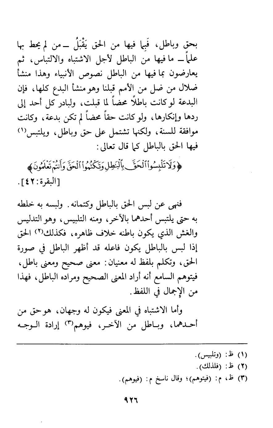 بحق وباطل فبما فيها من الحق يقبل من لم يحط بها علما ما فيها من الباطل لأجل الاشتباه والالتباس ثم يعارضون بما فيها من الباطل نصوص الأنبياء وهذا منشأ ضلال من ضل من الأمم قبلنا وهو منشأ البدع كلها فإن البدعة لو كانت باطلا محضا لما قبلت ولبادر كل أحد إلى ردها وإنكارها ولو كانت حقا محضا لم تكن بدعة وكانت موافقة للسنة ولكنها تشتمل على حق وباطل ويلتبس فيها الحق بالباطل كما قال تعالى: {وَلا تَلْبِسُوا الْحَقَّ بِالْبَاطِلِ وَتَكْتُمُوا الْحَقَّ وَأَنْتُمْ تَعْلَمُونَ} [البقرة42] فنهى عن لبس الحق بالباطل وكتمانه ولبسه به خلطه به حتى يلتبس أحدهما بالآخر ومنه التلبيس وهو التدليس والغش الذي يكون باطنه خلاف ظاهره فكذلك الحق إذا لبس بالباطل يكون فاعله قد أظهر الباطل في صورة الحق وتكلم بلفظ له معنيان معنى صحيح ومعنى باطل فيتوهم السامع أنه أراد المعنى الصحيح ومراده الباطل فهذا من الإجمال في اللفظ.