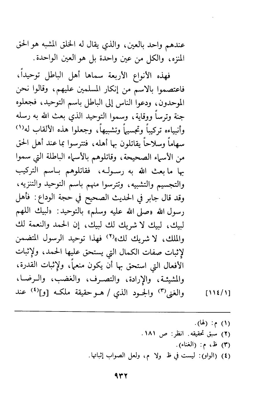 فهذه الأنواع الأربعة سماها أهل الباطل توحيدا فاعتصموا بالاسم من إنكار المسلمين عليهم وقالوا نحن الموحدون ودعوا الناس إلى الباطل باسم التوحيد فجعلوه جنة وترسا ووقاية وسموا التوحيد الذي بعث الله به رسله وأنبياءه تركيبا وتجسيما وتشبيها وجعلوا هذه الألقاب له سهاما وسلاحا يقاتلون بها أهله فتترسوا بما عند أهل الحق من الأسماء الصحيحة وقاتلوهم بالأسماء الباطلة التي سموا بها ما بعث الله به رسوله فقاتلوهم باسم التركيب والتجسيم والتشبيه وتترسوا منهم باسم التوحيد والتنزيه وقد قال جابر في الحديث الصحيح في حجة الوداع فأهل رسول الله بالتوحيد لبيك اللهم لبيك لبيك لا شريك لك لبيك إن الحمد والنعمة لك والملك لا شريك لك فهذا توحيد الرسول المتضمن لإثبات صفات الكمال التي يستحق عليها الحمد ولإثبات الأفعال التي استحق بها أن يكون منعما ولإثبات القدرة والمشيئة والإرادة والتصرف والغضب والرضا والغنى والجود الذي هو حقيقة ملكه وعند