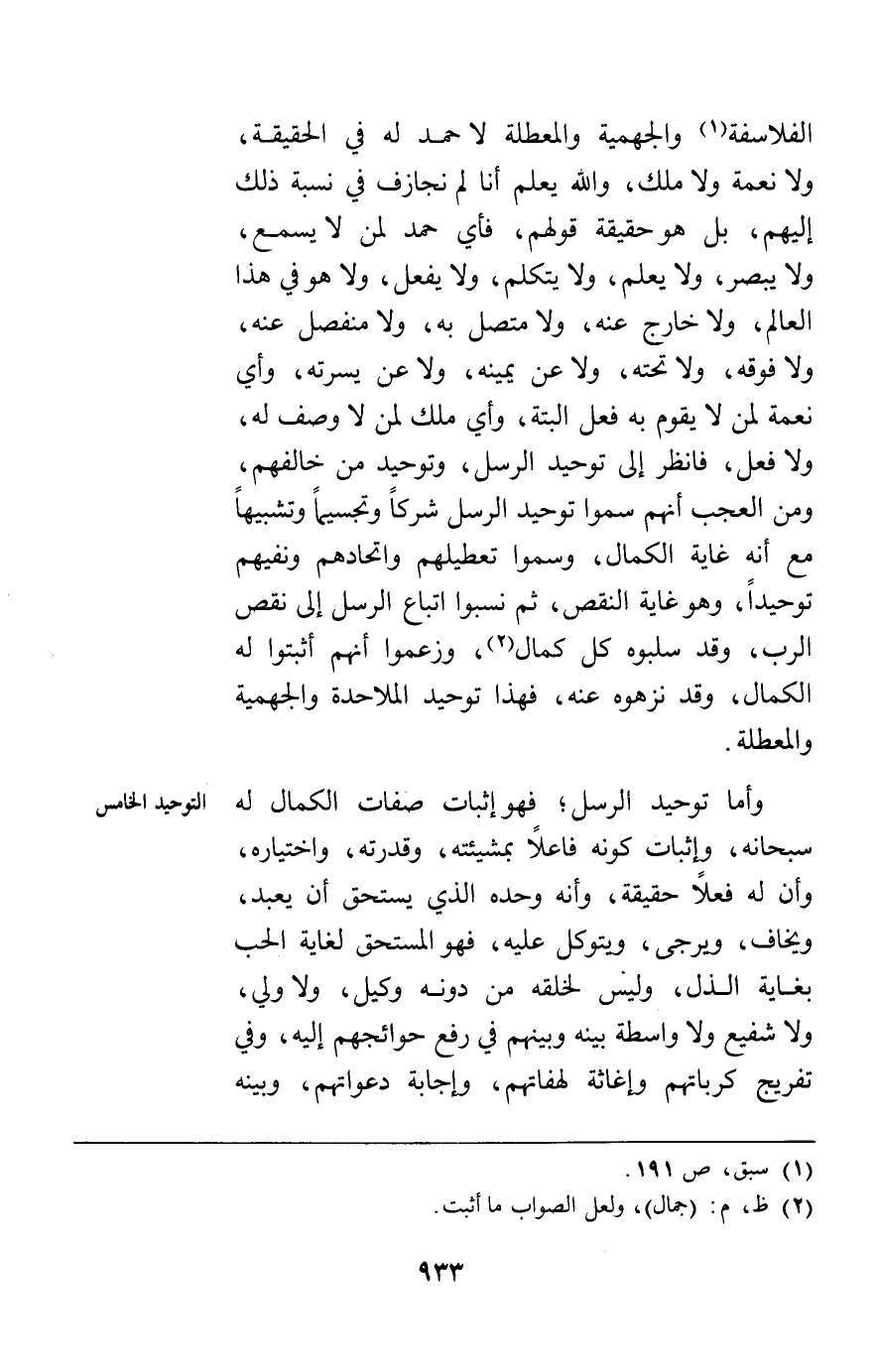 الفلاسفة والجهمية والمعطلة لا حمد له في الحقيقة ولا نعمة ولا ملك والله يعلم أنا لم نجازف في نسبة ذلك إليهم بل هو حقيقة قولهم فأي حمد لمن لا يسمع ولا يبصر ولا يعلم ولا يتكلم ولا يفعل ولا هو في هذا العالم ولا خارج عنه ولا متصل به ولا منفصل عنه ولا فوقه ولا تحته ولا عن يمينه ولا عن يسرته وأي نعمة لمن لا يقوم به فعل البتة وأي ملك لمن لا وصف له ولا فعل فانظر إلى توحيد الرسل وتوحيد من خالفهم ومن العجب أنهم سموا توحيد الرسل شركا وتجسيما وتشبيها مع أنه غاية الكمال وسموا تعطيلهم واتحادهم ونفيهم توحيدا وهو غاية النقص ثم نسبوا اتباع الرسل إلى نقص الرب وقد سلبوه كل كمال وزعموا أنهم أثبتوا له الكمال وقد نزهوه عنه فهذا توحيد الملاحدة والجهمية والمعطلة.