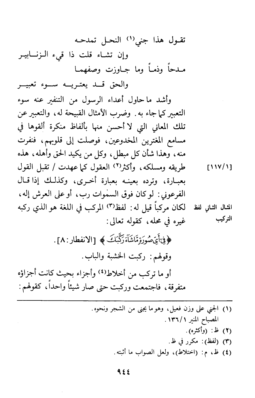 وأشد ما حاول أعداء الرسول من التنفير عنه سوء التعبير عما جاء به وضرب الأمثال القبيحة له والتعبير عن تلك المعاني التي لا أحسن منها بألفاظ منكرة ألقوها في مسامع المغترين المخدوعين فوصلت إلى قلوبهم فنفرت منه وهذا شأن كل مبطل وكل من يكيد الحق وأهله هذه طريقه ومسلكه وأكثر العقول كما عهدت تقبل القول بعبارة وترده بعينه بعبارة أخرى وكذلك إذا قال الفرعوني لو كان فوق السموات رب أو على العرش إله لكان مركبا قيل له لفظ المركب في اللغة هو الذي ركبه غيره في محله كقوله تعالى: {فِي أَيِّ صُورَةٍ مَا شَاءَ رَكَّبَكَ} [الانفطار8] وقولهم ركبت الخشبة والباب أو ما تركب من أخلاط وأجزاء بحيث كانت أجزاؤه متفرقة فاجتمعت وركبت حتى صار شيئا واحدا كقولهم: