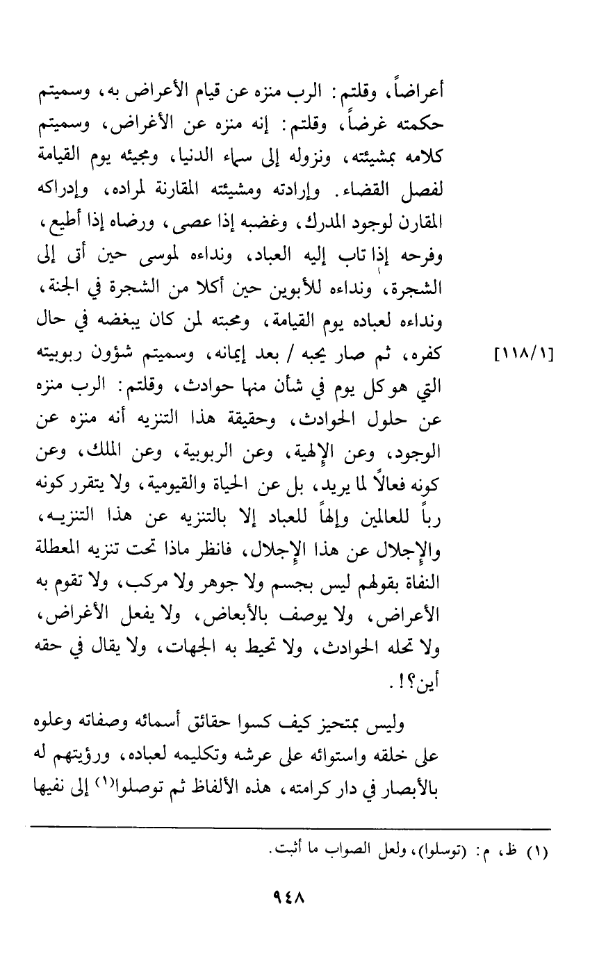 أعراضا وقلتم الرب منزه عن قيام الأعراض به وسميتم حكمته غرضا وقلتم إنه منزه عن الأغراض وسميتم كلامه بمشيئته ونزوله إلى سماء الدنيا ومجيئه يوم القيامة لفصل القضاء وإرادته ومشيئته المقارنة لمراده وإدراكه المقارن لوجود المدرك وغضبه إذا عصى ورضاه إذا أطيع وفرحه إذا تاب إليه العباد ونداءه لموسى حين أتى إلى الشجرة ونداءه للأبوين حين أكلا من الشجرة في الجنة ونداءه لعباده يوم القيامة ومحبته لمن كان يبغضه في حال كفره ثم صار يحبه بعد إيمانه وسميتم شؤون ربوبيته التي هو كل يوم في شأن منها حوادث وقلتم الرب منزه عن حلول الحوادث وحقيقة هذا التنزيه أنه منزه عن الوجود وعن الإلهية وعن الربوبية وعن الملك وعن كونه فعالا لما يريد بل عن الحياة والقيومية ولا يتقرر كونه ربا للعالمين وإلها للعباد إلا بالتنزيه عن هذا التنزيه والإجلال عن هذا الإجلال فانظر ماذا تحت تنزيه المعطلة النفاة بقولهم ليس بجسم ولا جوهر ولا مركب ولا تقوم به الأعراض ولا يوصف بالأبعاض ولا يفعل الأغراض ولا تحله الحوادث ولا تحيط به الجهات ولا يقال في حقه أين.