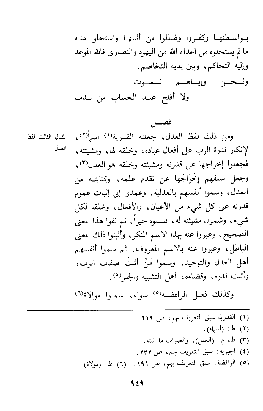 ومن ذلك لفظ العدل جعلته القدرية اسما لإنكار قدرة الرب على أفعال عباده وخلقه لها ومشيئته فجعلوا إخراجها عن قدرته ومشيئته وخلقه هو العدل وجعل سلفهم إخراجها عن تقدم علمه وكتابته من العدل وسموا أنفسهم بالعدلية وعمدوا إلى إثبات عموم قدرته على كل شيء من الأعيان والأفعال وخلقه لكل شيء وشمول مشيئته له فسموه حيزا ثم نفوا هذا المعنى الصحيح وعبروا عنه بهذا الاسم المنكر واثبتوا ذلك المعنى الباطل وعبروا عنه بالاسم المعروف ثم سموا أنفسهم أهل العدل والتوحيد وسموا من أثبت صفات الرب وأثبت قدره وقضاءه أهل التشبيه والجبر.