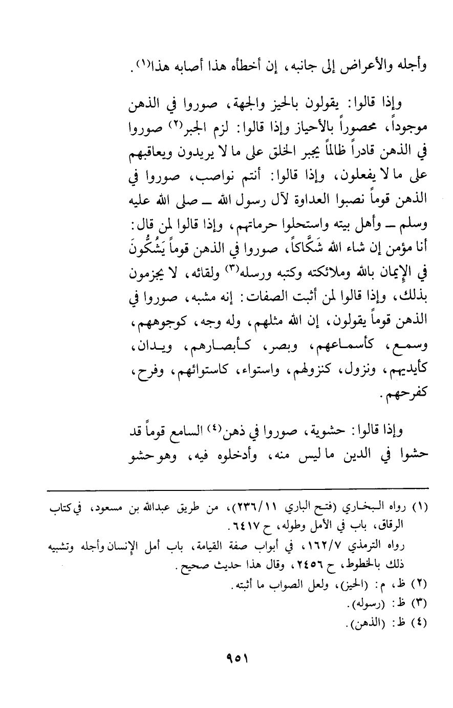 وإذا قالوا يقولون بالحيز والجهة صوروا في الذهن موجودا محصورا بالأحياز وإذا قالوا لزم الجبر صوروا في الذهن قادرا ظالما يجبر الخلق على ما لا يريدون ويعاقبهم على ما لا يفعلون وإذا قالوا أنتم نواصب صوروا في الذهن قوما نصبوا العداوة لآل رسول الله وأهل بيته واستحلوا حرماتهم وإذا قالوا لمن قال أنا مؤمن إن شاء الله شكاكا صوروا في الذهن قوما يشكون في الإيمان بالله وملائكته وكتبه ورسله ولقائه لا يجزمون بذلك وإذا قالوا لمن أثبت الصفات إنه مشبه صوروا في الذهن قوما يقولون إن الله مثلهم وله وجه كوجوههم وسمع كأسماعهم وبصر كأبصارهم ويدان كأيديهم ونزول كنزولهم واستواء كاستوائهم وفرح كفرحهم. وإذا قالوا حشوية صوروا في ذهن السامع قوما قد حشوا في الدين ما ليس منه وأدخلوه فيه وهو حشو