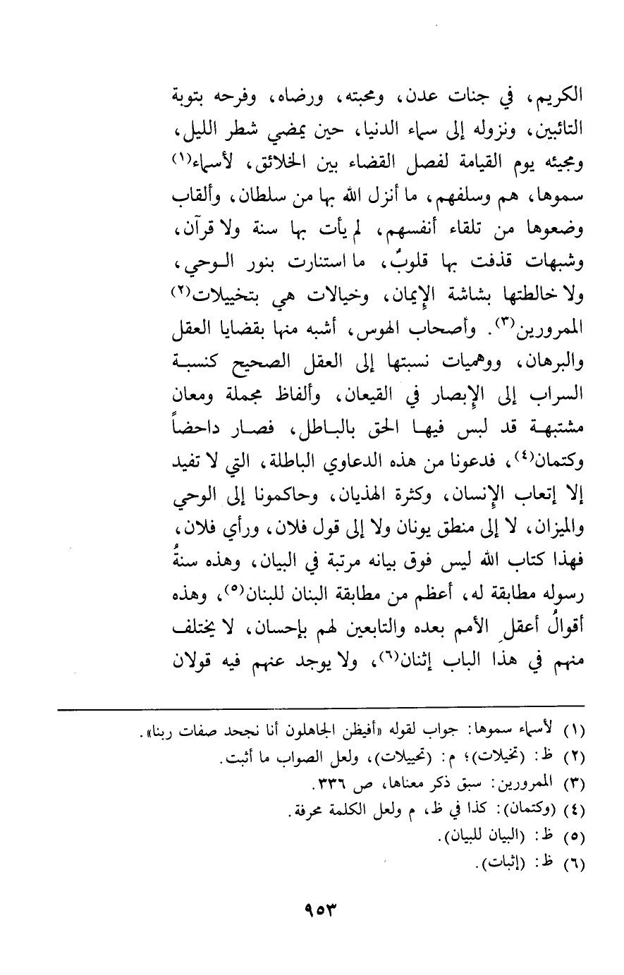 الكريم في جنات عدن ومحبته ورضاه وفرحه بتوبة التائبين ونزوله إلى سماء الدنيا حين يمضي شطر الليل ومجيئه يوم القيامة لفصل القضاء بين الخلائق لأسماء سموها هم وسلفهم ما أنزل الله بها من سلطان وألقاب وضعوها من تلقاء أنفسهم لم يأت بها سنة ولا قرآن وشبهات قذفت بها قلوب ما استنارت بنور الوحي ولا خالطتها بشاشة الإيمان وخيالات هي بتخييلات الممرورين وأصحاب الهوس أشبه منها بقضايا العقل والبرهان ووهميات نسبتها إلى العقل الصحيح كنسبة السراب إلى الإبصار في القيعان وألفاظ مجملة ومعان مشتبهة قد لبس فيها الحق بالباطل فصار داحضا وكتمان فدعونا من هذه الدعاوي الباطلة التي لا تفيد إلا إتعاب الإنسان وكثرة الهذيان وحاكمونا إلى الوحي والميزان لا إلى منطق يونان ولا إلى قول فلان ورأي فلان فهذا كتاب الله ليس فوق بيانه مرتبة في البيان وهذه سنة رسوله مطابقة له أعظم من مطابقة البنان للبنان وهذه أقوال أعقل الأمم بعده والتابعين لهم بإحسان لا يختلف منهم في هذا الباب إثنان ولا يوجد عنهم فيه قولان