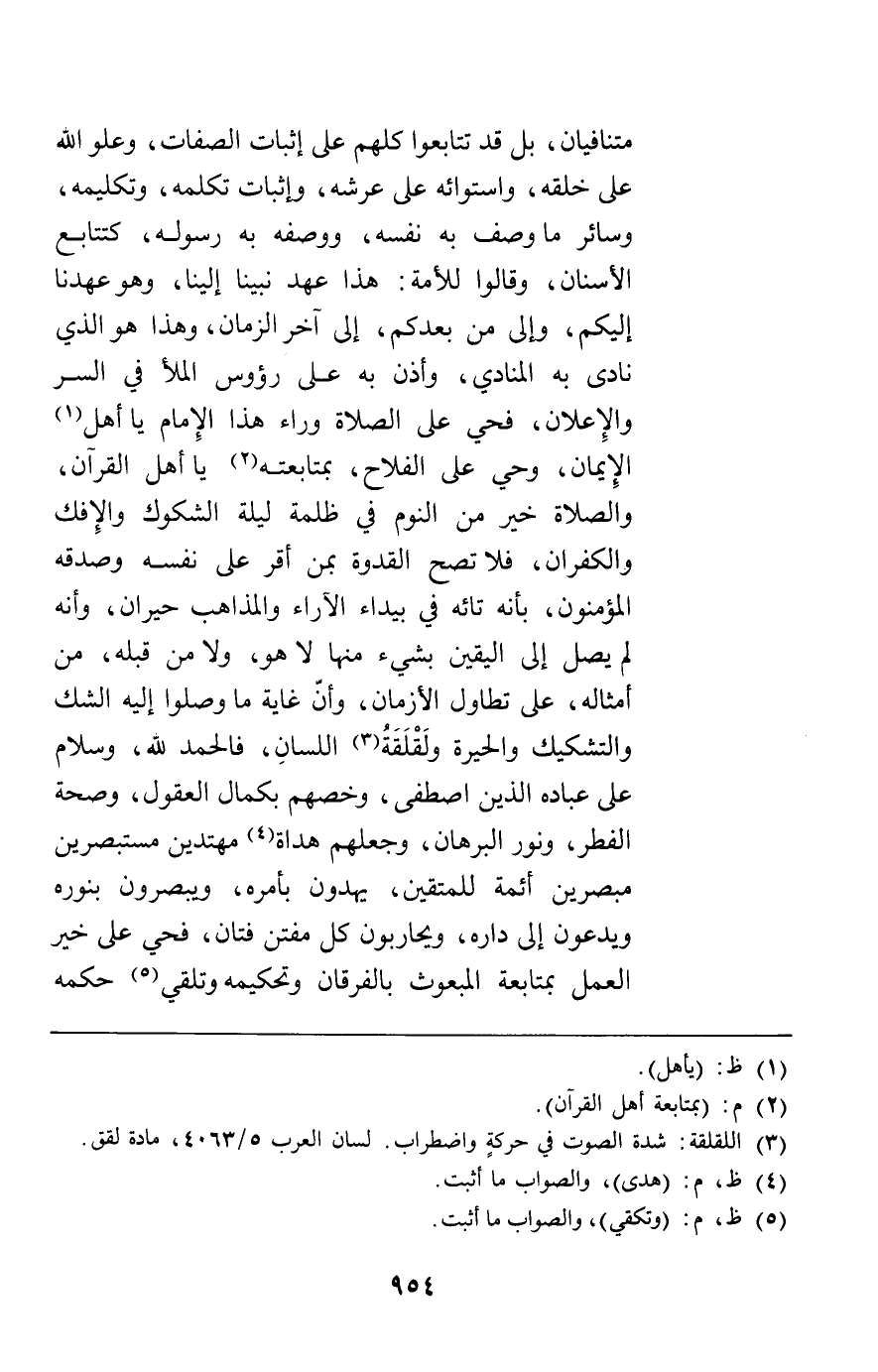 متنافيان بل قد تتابعوا كلهم على إثبات الصفات وعلو الله على خلقه واستوائه على عرشه وإثبات تكلمه وتكليمه وسائر ما وصف به نفسه ووصفه به رسوله كتابع الأسنان وقالوا للأمة هذا عهد نبينا إلينا وهو عهدنا إليكم وإلى من بعدكم إلى آخر الزمان وهذا هو الذي نادى به المنادي وأذن به على رؤوس الملأ في السر والإعلان فحي على الصلاة وراء هذا الإمام يا أهل الإيمان وحي على الفلاح بمتابعته يا أهل القرآن والصلاة خير من النوم في ظلمة ليلة الشكوك والإفك والكفران فلا تصح القدوة بمن أقر على نفسه وصدقه المؤمنون بأنه تائه في بيداء الآراء والمذاهب حيران وأنه لم يصل إلى اليقين بشيء منها لا هو ولا من قبله من أمثاله على تطاول الأزمان وأن غاية ما وصلوا إليه الشك والتشكيك والحيرة ولقلقة اللسان فالحمد لله وسلام على عباده الذين اصطفى وخصهم بكمال العقول وصحة الفطر ونور البرهان وجعلهم هداة مهتدين مستبصرين مبصرين أئمة للمتقين يهدون بأمره ويبصرون بنوره ويدعون إلى داره ويحاربون كل مفتن فتان فحي على خير العمل بمتابعةالمبعوث بالفرقان وتحكيمه وتلقي حكمه