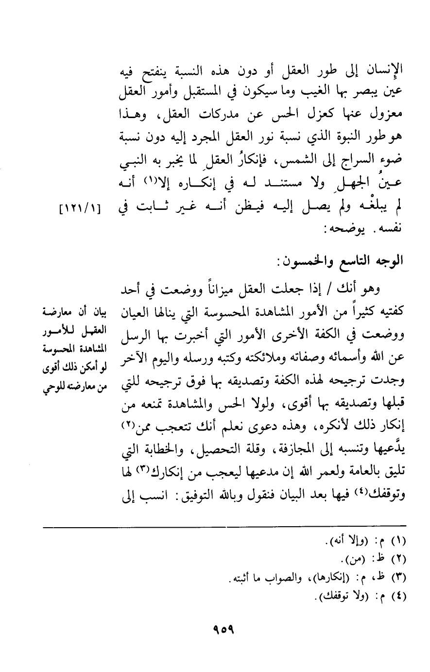 الإنسان إلى طور العقل أو دون هذه النسبة ينفتح فيه عين يبصر بها الغيب وما سيكون في المستقبل وأمور العقل معزول عنها كعزل الحس عن مدركات العقل وهذا هو طور النبوة الذي نسبة نور العقل المجرد إليه دون نسبة ضوء السراج إلى الشمس فإنكار العقل لما يخبر به النبي عين الجهل ولا مستند له في إنكاره إلا أنه لم يبلغه ولم يصل إليه فيظن أنه غير ثابت في نفسه يوضحه: