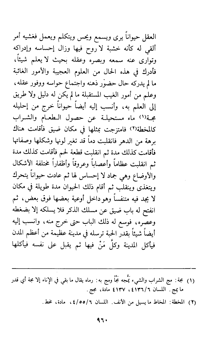 العقل حيوانا يرى ويسمع ويحس ويتكلم ويعمل فغشيه أمر ألقي له كأنه خشبة لا روح فيها وزال إحساسه وإدراكه وتوارى عنه سمعه وبصره وعقله بحيث لا يعلم شيئا فأدرك في هذه الحال من العلوم العجيبة والأمور الغائبة مالم يدركه حال حضور ذهنه واجتماع حواسه ووفور عقله وعلم من أمور الغيب المستقبلة مالم يكن له دليل ولا طريق إلى العلم به وأنسب إليه أيضا حيوانا خرج من إحليله مجة ماء مستحيلة عن حصول الطعام والشراب كالمخطة فامتزجت بمثلها في مكان ضيق فأقامت هناك برهة من الدهر فانقلبت دما قد تغير لونها وشلكها وصفاتها فأقامت كذلك مدة ثم انقلبت قطعة لحم فأقامت كذلك مدة ثم انقلبت عظاما وأعصابا وعروقا وأظفارا مختلفة الأشكال والأوضاع وهي جماد لا إحساس لها ثم عادت حيوانا يتحرك ويتغذى وينقلب ثم أقام ذلك الحيوان مدة طويلة في مكان لا يجد فيه متنفسا وهو داخل أوعية بعضها فوق بعض ثم انفتح له باب ضيق عن مسلك الذكر فلا يسلكه إلا بضغطه وعصره فوسع له ذلك الباب حتى خرج منه وانسب إليه أيضا شيئا بقدر الحبة ترسله في مدينة عظيمة من أعظم المدن فيأكل المدينة وكل من فيها ثم يقبل على نفسه فيأكلها