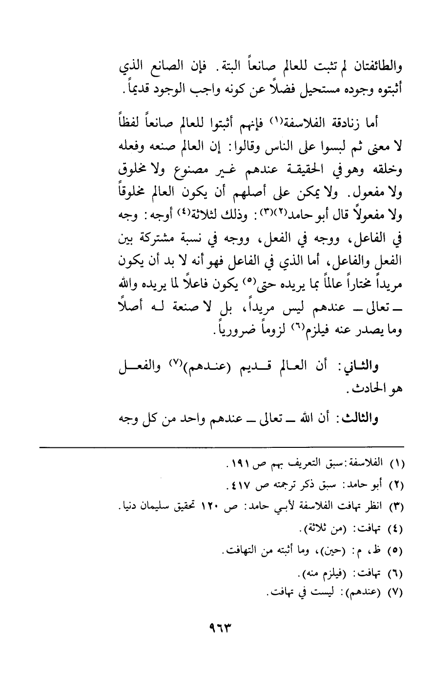 أما زنادقة الفلاسفة فإنهم أثبتوا للعالم صانعا لفظا لا معنى ثم لبسوا على الناس وقالوا إن العالم صنعه وفعله وخلقه وهو في الحقيقة عندهم غير مصنوع ولا مخلوق ولا مفعول ولا يمكن على أصلهم أن يكون العالم مخلوقا ولا مفعولا قال أبو حامد وذلك لثلاثة أوجه: