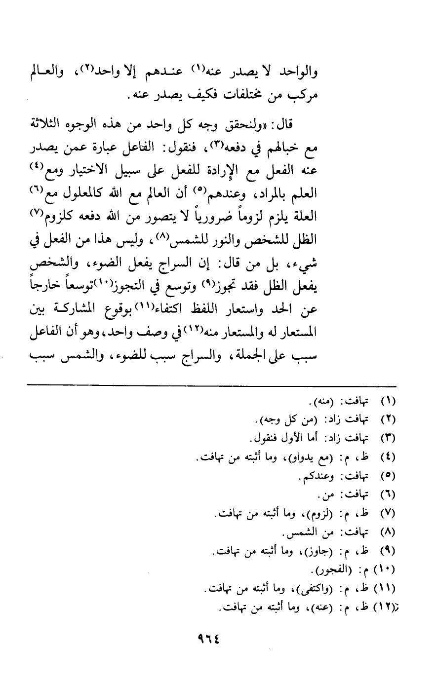 والواحد لا يصدر عنه عندهم إلا واحد والعالم مركب من مختلفات فكيف يصدر عنه قال ولنحقق وجه كل واحد من هذه الوجوه الثلاثة مع جدالهم في دفعه فنقول الفاعل عبارة عمن يصدر عنه الفعل مع الإرادة للفعل على سبيل الاختيار ومع العلم بالمراد وعندهم أن العالم مع الله كالمعلول مع العلة يلزم لزوما ضروريا لا يتصور من الله دفعه كلزوم الظل للشخص والنور للشمس وليس هذا من الفعل في شيء بل من قال إن السراج يفعل الضوء والشخص يفعل الظل فقد تجوز وتوسع في التجوز توسعا خارجا عن الحد واستعار اللفظ اكتفاء بوقوع المشاركة بين المستعار له والمستعار منه في وصف واحد وهو أن الفاعل سبب على الجملة والسراج سبب للضوء والشمس سبب