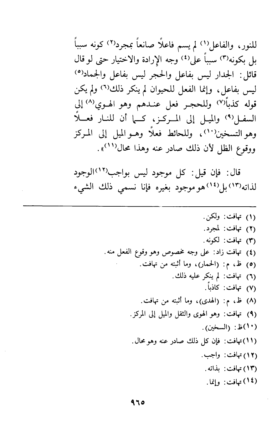 للنور والفاعل لم يسم فاعلا صانعا بمجرد كونه سببا بل بكونه سببا على وجه الإرادة والاختيار حتى لو قال قائل الجدار ليس بفاعل والحجر ليس بفاعل والجماد ليس بفاعل وإنما الفعل للحيوان لم ينكر ذلك ولم يكن قوله كذبا وللحجر فعل عندهم وهو الهوي إلى السفل والميل إلى المركز كما أن للنار فعلا وهو التسخين وللحائط فعلا وهو الميل إلى المركز ووقوع الظل لأن ذلك صادر عنه وهذا محال.