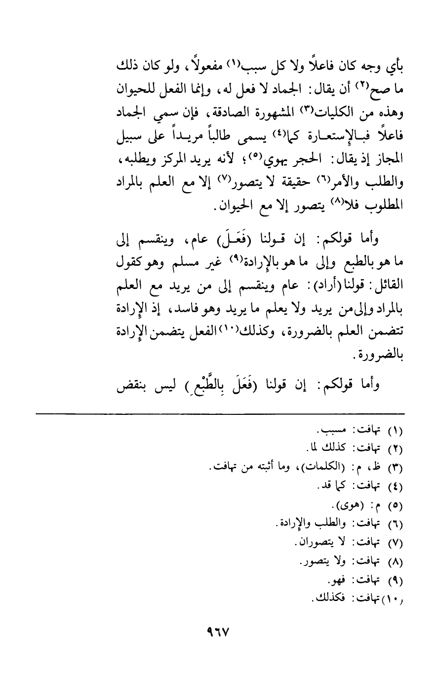 وأما قولكم إن قولنا فعل عام وينقسم إلى ما هو بالطبع وإلى ما هو بالإرادة غير مسلم وهو كقول القائل قولنا أراد عام وينقسم إلى من يريد مع العلم بالمراد وإلى من يريد ولا يعلم ما يريد وهو فاسد إذ الإرادة تتضمن العلم بالضرورة وكذلك الفعل يتضمن الإرادة بالضرورة.