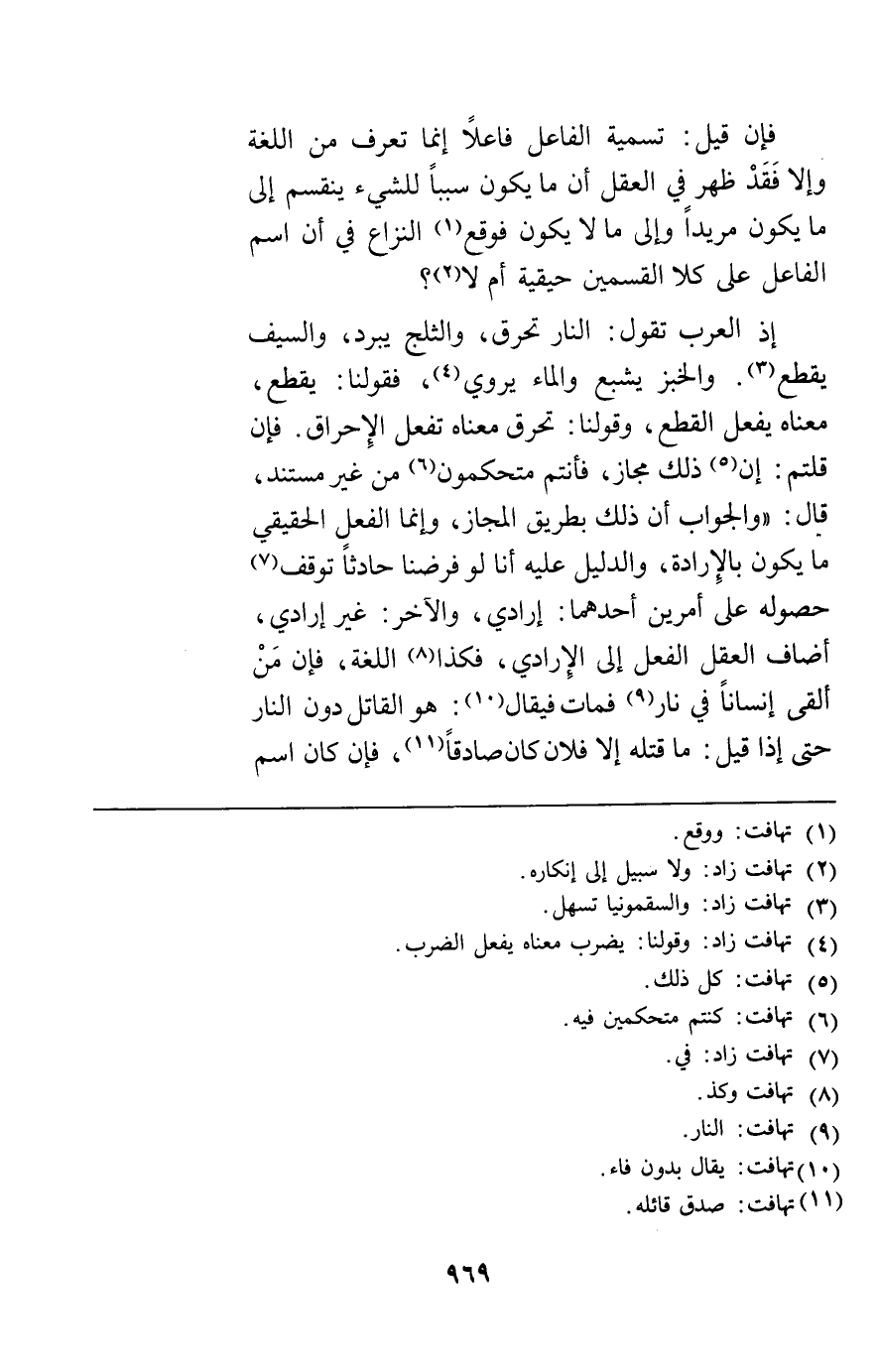 إذ العرب تقول النار تحرق والثلج يبرد والسيف يقطع والخبز يشبع والماء يروي فقولنا يقطع معناه يفعل القطع وقولنا تحرق معناه تفعل الإحراق فإن قلتم إن ذلك مجاز فأنتم متحكمون من غير مستند قال والجواب أن ذلك بطريق المجاز وإنما الفعل الحقيقي ما يكون بالإرادة والدليل عليه أنا لو فرضنا حادثا توقف حصوله على أمرين أحدهما إرادي والآخر غير إرادي أضاف العقل الفعل إلى الإرادي فكذا اللغة فإن من ألقى إنسانا في نار فمات فيقال هو القاتل دون النار حتى إذا قيل ما قتله إلا فلان كان صادقا فإن كان اسم