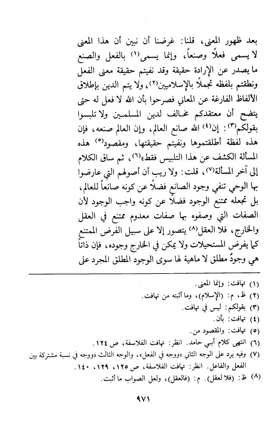 بعد ظهور المعنى قلنا غرضنا أن نبين أن هذا المعنى لا يسمى فعلا وصنعا وإنما يسمى بالفعل والصنع ما يصدر عن الإرادة حقيقة وقد نفيتم حقيقة معنى الفعل ونطقتم بلفظه تجملا بالإسلاميين ولا يتم الدين بإطلاق الألفاظ الفارغة عن المعاني فصرحوا بأن الله لا فعل له حتى يتضح أن معتقدكم مخالف لدين المسلمين ولا تلبسوا بقولكم إن الله صانع العالم وإن العالم صنعه فإن هذه لفظة أطلقتموها ونفيتم حقيقتها ومقصود هذه المسألة الكشف عن هذا التلبيس فقط ثم ساق الكلام إلى آخر المسألة قلت ولا ريب أن أصولهم التي عارضوا بها الوحي تنفي وجود الصانع فضلا عن كونه صانعا للعالم بل تجعله ممتنع الوجود فضلا عن كونه واجب الوجود لأن الصفات التي وصفوه بها صفات معدوم ممتنع في العقل والخارج فلا العقل يتصور إلا على سبيل الفرض الممتنع كما يفرض المستحيلات ولا يمكن في الخارج وجوده فإن ذاتا هي وجود مطلق لا ماهية لها سوى الوجود المطلق المجرد على