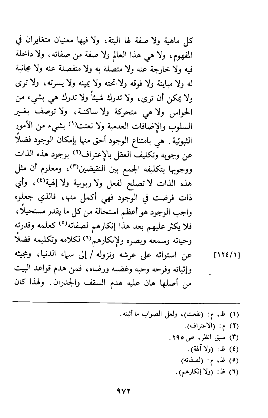 كل ماهية ولا صفة لها البتة ولا فيها معنيان متغايران في المفهوم ولا هي هذا العالم ولا صفة من صفاته ولا داخلة فيه ولا خارجة عنه ولا متصلة به ولا منفصلة عنه ولا مجانبة له ولا مباينة ولا فوقه ولا تحته ولا يمينه ولا يسرته ولا ترى ولا يمكن أن ترى ولا تدرك شيئا ولا تدرك هي بشيء من الحواس ولا هي متحركة ولا ساكنة ولا توصف بغير السلوب والإضافات العدمية ولا نعتت بشيء من الأمور الثبوتية هي بامتناع الوجود أحق منها بإمكان الوجود فضلا عن وجوبه وتكليف العقل بالإعتراق بوجود هذه الذات ووجوبها كتكليفه الجمع بين النقيضين ومعلوم أن مثل هذه الذات لا تصلح لفعل ولا ربوبية ولا إلهية وأي ذات فرضت في الوجود فهي أكمل منها فالذي جعلوه واجب الوجود هو أعظم استحالة من كل ما يقدر مستحيلا فلا يكثر عليهم بعد هذا إنكارهم لصفاته كعلمه وقدرته وحياته وسمعه وبصره ولا إنكارهم لكلامه وتكليمه فضلا عن استوائه على عرشه ونزوله إلى سماء الدنيا ومجيئه وإتيانه وفرحه وحبه وغضبه ورضاه فمن هدم قواعد البيت من أصلها هان عليه هدم السقف والجدران ولهذا كان