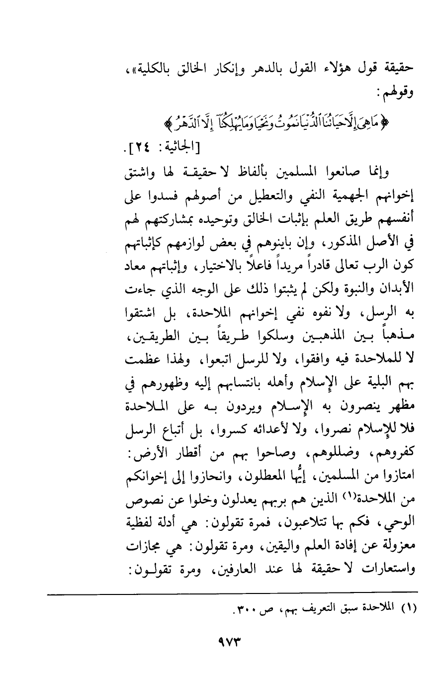 حقيقة قول هؤلاء القول بالدهر وإنكار الخالق بالكلية وقولهم {وَقَالُوا مَا هِيَ إِلاَّ حَيَاتُنَا الدُّنْيَا نَمُوتُ وَنَحْيَا وَمَا يُهْلِكُنَا إِلَّا الدَّهْرُ} [الجاثية24] وإنما صانعوا المسلمين بألفاظ لا حقيقة لها واشتق إخوانهم الجهمية النفي والتعطيل من أصولهم فسدوا على أنفسهم طريق العلم بإثبات الخالق وتوحيده بمشاركتهم لهم في الأصل المذكور وإن باينوهم في بعض لوازمهم كإثباتهم كون الرب تعالى قادرا مريدا فاعلا بالاختيار وإثباتهم معاد الأبدان والنبوة ولكن لم يثبتوا ذلك على الوجه الذي جاءت به الرسل ولا نفوه نفي إخوانهم الملاحدة بل اشتقوا مذهبا بين المذهبين وسلكوا طريقا بين الطريقين لا للملاحدة فيه وافقوا ولا للرسل اتبعوا ولهذا عظمت بهم البلية على الإسلام وأهله بانتسابهم إليه وظهورهم في مظهر ينصرون به الإسلام ويردون به على الملاحدة فلا للإسلام نصروا ولا لأعدائه كسروا بل أتباع الرسل كفروهم وضللوهم وصاحوا بهم من أقطار الأرض امتازوا من المسلمين أيها المعطلون وانحازوا إلى إخوانكم من الملاحدة الذين هم بربهم يعدلون وخلوا عن نصوص الوحي فكم بها تتلاعبون فمرة تقولون هي أدلة لفظية معزولة عن إفادة العلم واليقين ومرة تقولون هي مجازات واستعارات لا حقيقة لها عند العارفين ومرة تقولون: