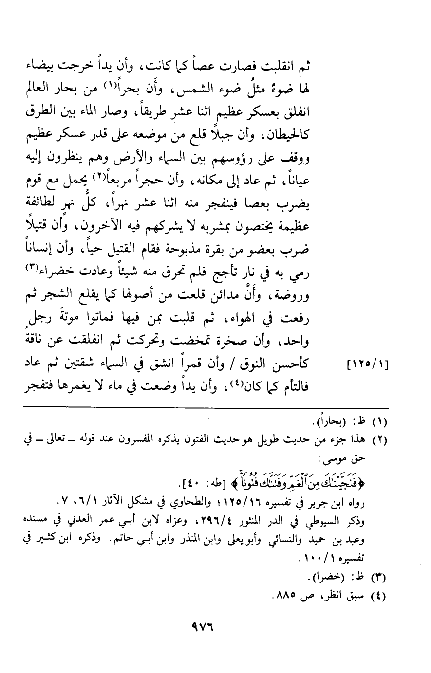 ثم انقلبت فصارت عصا كما كانت وأن يدا خرجت بيضاء لها ضوء مثل ضوء الشمس وأن بحرا من بحار العالم انفلق بعسكر عظيم اثني عشر طريقا وصار الماء بين الطرق كالحيطان وأن جبلا قلع من موضعه على قدر عسكر عظيم ووقف على رؤوسهم بين السماء والأرض وهم ينظرون إليه عيانا ثم عاد إلى مكانه وأن حجرا مربعا يحمل مع قوم يضرب بعصا فينفجر منه اثنا عشر نهرا كل نهر لطائفة عظيمة يختصون بمشربه لا يشركهم فيه الآخرون وأن قتيلا ضرب بعضو من بقرة مذبوحة فقام القتيل حيا وأن إنسانا رمي به في نار تأجج فلم تحرق منه شيئا وعادت خضراء وروضة وأن مدائن قلعت من أصولها كما يقلع الشجر ثم رفعت في الهواء ثم قلبت بمن فيها فماتوا موتة رجل واحد وأن صخرة تمخضت وتحركت ثم انفلقت عن ناقة كأحسن النوق وأن قمرا انشق في السماء شقتين ثم عاد فالتأم كما كان وأن يدا وضعت في ماء لا يغمرها فتفجر