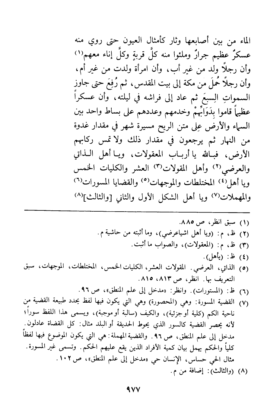 الماء من بين أصابعها وثار كأمثال العيون حتى روي منه عسكر عظيم جرار وملئوا منه كل قربة وكل إناء معهم وأن رجلا ولد من غير أب وأن امرأة ولدت من غير أم وأن رجلا حمل من مكة إلى بيت المقدس ثم رفع حتى جاوز السموات السبع ثم عاد إلى فراشه في ليلته وأن عسكرا عظيما قاموا بدوابهم وخدمهم وعددهم على بساط واحد بين السماء والأرض عل متن الريح مسيرة شهر في مقدار غدوة من النهار ثم يرجعون في مقدار ذلك ولا تمس ركابهم الأرض فبالله يا أرباب المعقولات ويا أهل الذاتي والعرضي وأهل المقولات العشر والكليات الخمس ويا أهل المختلطات والموجهات والقضايا المسورات والمهملات ويا أهل الشكل الأول والثاني والثالث