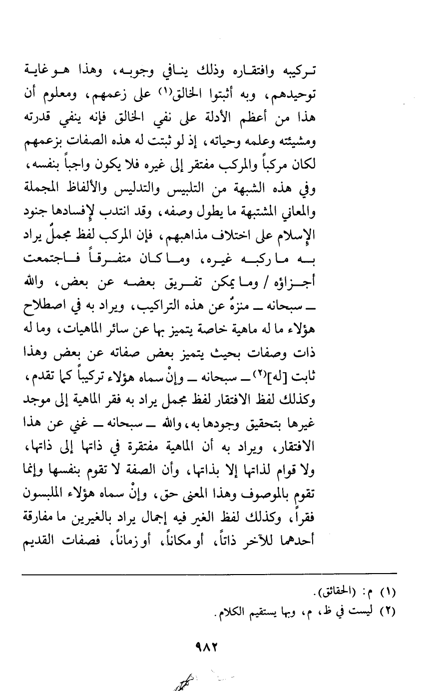 تركيبه وافتقاره وذلك ينافي وجوبه وهذا هو غاية توحيدهم وبه أثبتوا الخالق على زعمهم ومعلوم أن هذا من أعظم الأدلة على نفي الخالق فإنه ينفي قدرته ومشيئته وعلمه وحياته إذ لو ثبتت له هذه الصفات بزعمهم لكان مركبا والمركب مفتقر إلى غيره فلا يكون واجبا بنفسه وفي هذه الشبهة من التلبيس والتدليس والألفاظ المجملة والمعاني المشتبهة ما يطول وصفه وقد انتدب لإفسادها جنود الإسلام على اختلاف مذاهبهم فإن المركب لفظ مجمل يراد به ما ركبه غيره وما كان متفرقا فاجتمعت أجزاؤه وما يمكن تفريق بعضه عن بعض والله سبحانه منزه عن هذه التراكيب ويراد به في اصطلاح هؤلاء ماله ماهية خاصة يتميز بها عن سائر الماهيات وما له ذات وصفات بحيث يتميز بعض صفاته عن بعض وهذا ثابت له سبحانه وإن سماه هؤلاء تركيبا كما تقدم وكذلك لفظ الافتقار لفظ مجمل يراد به فقر الماهية إلى موجد غيرها بتحقيق وجودها به والله سبحانه غني عن هذا الافتقار ويراد به أن الماهية مفتقرة في ذاتها إلى ذاتها ولا قوام لذاتها إلا بذاتها وأن الصفة لا تقوم بنفسها وإنما تقوم بالموصوف وهذا المعنى حق وإن سماه هؤلاء الملبسون فقرا وكذلك لفظ الغير فيه إجمال يراد بالغيرين ما مفارقة أحدهما للآخر ذاتا أو مكانا أو زمانا فصفات القديم