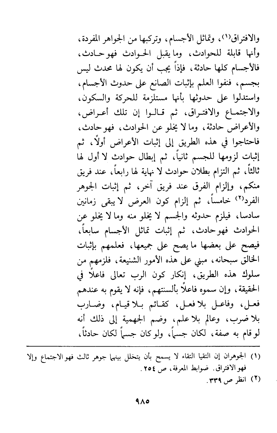 والافتراق وتماثل الأجسام وتركبها من الجواهر المفردة وأنها قابلة للحوادث وما يقبل الحوادث فهو حادث فالأجسام كلها حادثة فإذا يجب أن يكون لها محدث ليس بجسم فنفوا العلم بإثبات الصانع على حدوث الأجسام واستدلوا على حدوثها بأنها مستلزمة للحركة والسكون والاجتماع والافتراق ثم قالوا إن تلك أعراض والأعراض حادثة ومالا يخلو عن الحوادث فهو حادث فاحتاجوا في هذه الطريق إلى إثبات الأعراض أولا ثم إثبات لزومها للجسم ثانيا ثم إبطال حوادث لا أول لها ثالثا ثم التزام بطلان حوادث لا نهاية لها رابعا عند فريق منكم وإلزام الفرق عند فريق آخر ثم إثبات الجوهر الفرد خامسا ثم إلزام كون العرض لا يبقى زمانين سادسا فيلزم حدوثه والجسم لا يخلو منه ومالا يخلو عن الحوادث فهو حادث ثم إثبات تماثل الأجسام سابعا فيصح على بعضها ما يصح على جميعها فعلمهم بإثبات الخالق سبحانه مبني على هذه الأمور الشنيعة فلزمهم من سلوك هذه الطريق إنكار كون الرب تعالى فاعلا في الحقيقة وإن سموه فاعلا بألسنتهم فإنه لا يقوم به عندهم فعل وفاعل بلا فعل كقائم بلا قيام وضارب بلا ضرب وعالم بلا علم وضم الجهمية إلى ذلك أنه لو قام به صفة لكان جسما ولو كان جسما لكان حادثا