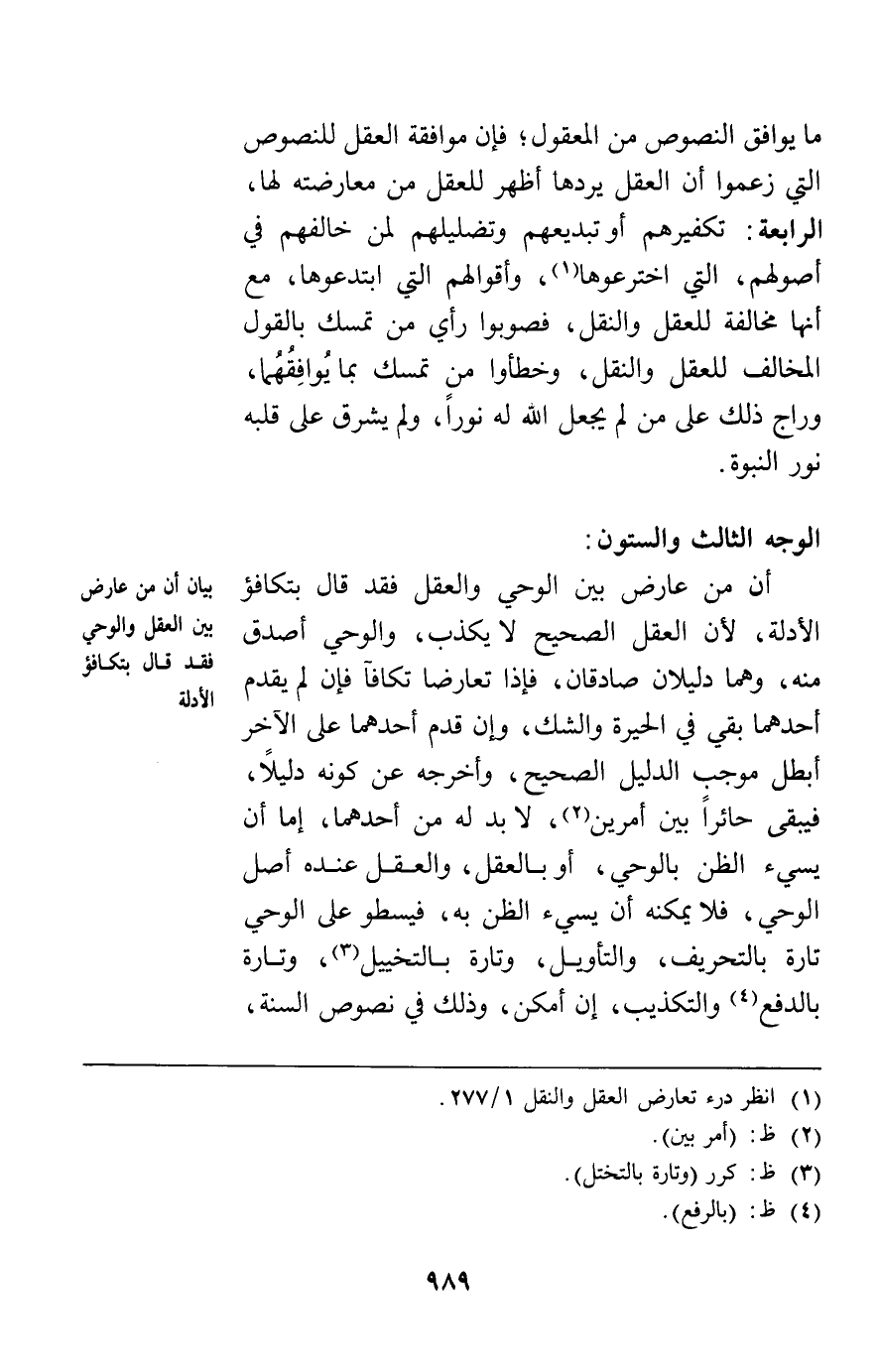 الوجه الثالث والستون: أن من عارض بين الوحي والعقل فقد قال بتكافؤ الأدلة لأن العقل الصحيح لا يكذب والوحي أصدق منه وهما دليلان صادقان فإذا تعارضا تكافآ فإن لم يقدم أحدهما بقي في الحيرة والشك وإن قدم أحدهما على الآخر أبطل موجب الدليل الصحيح وأخرجه عن كونه دليلا فيبقى حائرا بين أمرين لا بد له من أحدهما إما أن يسيء الظن بالوحي أو بالعقل والعقل عنده أصل الوحي فلا يمكنه أن يسيء الظن به فيسطو على الوحي تارة بالتحريف والتأويل وتارة بالتخييل وتارة بالدفع والتكذيب إن أمكن وذلك في نصوص السنة