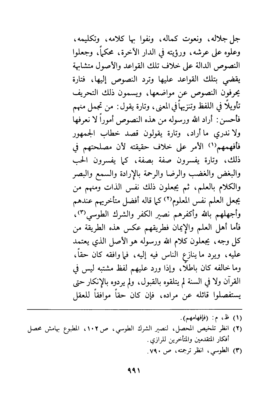 جل جلاله ونعوت كماله ونفوا بها كلامه وتكليمه وعلوه على عرشه ورؤيته في الدار الآخرة محكما وجعلوا النصوص الدالة على خلاف تلك القواعد والأصول متشابهة يقضي بتلك القواعد عليها وترد النصوص إليها فتارة يحرفون النصوص عن مواضعها ويسمون ذلك التحريف تأويلا في اللفظ وتنزيها في المعنى وتارة يقول من تجمل منهم فأحسن أراد الله ورسوله من هذه النصوص أمورا لا نعرفها ولا ندري ما أراد وتارة يقولون قصد خطاب الجمهور فأفهمهم الأمر على خلاف حقيقته لأن مصلحتهم في ذلك وتارة يفسرون صفة بصفة كما يفسرون الحب والبغض والغضب والرضا والرحمة بالإرادة والسمع والبصر والكلام بالعلم ثم يجعلون ذلك نفس الذات ومنهم من يجعل العلم نفس المعلوم كما قاله أفضل متأخريهم عندهم وأجهلهم بالله وأكفرهم نصير الكفر والشرك الطوسي فأما أهل العلم والإيمان فطريقهم عكس هذه الطريقة من كل وجه يجعلون كلام الله ورسوله هو الأصل الذي يعتمد عليه ويرد ما يتنازع الناس فيه إليه فما وافقه كان حقا وما خالفه كان باطلا وإذا ورد عليهم لفظ مشتبه ليس في القرآن ولا في السنة لم يتلقوه بالقبول ولم يردوه بالإنكار حتى يستفصلوا قائله عن مراده فإن كان حقا موافقا للعقل