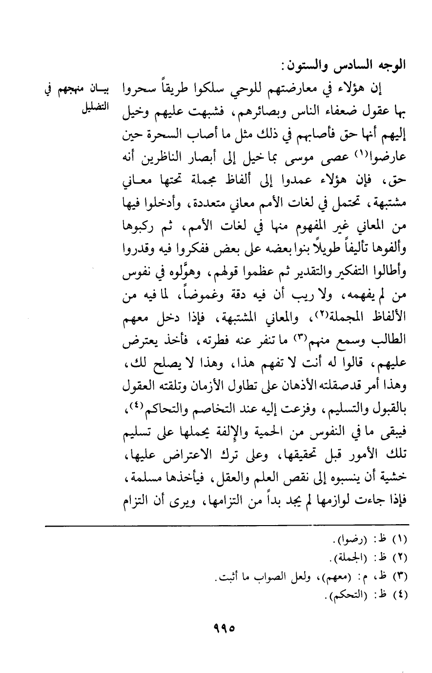 الوجه السادس والستون: إن هؤلاء في معارضتهم للوحي سلكوا طريقا سحروا بها عقول ضعفاء الناس وبصائرهم فشبهت عليهم وخيل إليهم أنها حق فأصابهم في ذلك مثل ما أصاب السحرة حين عارضوا عصى موسى بما خيل إلى أبصار الناظرين أنه حق فإن هؤلاء عمدوا إلى ألفاظ مجملة تحتها معاني مشتبهة تحتمل في لغات الأمم معاني متعددة وأدخلوا فيها من المعاني غير المفهوم منها في لغات الأمم ثم ركبوها وألفوها تأليفا طويلا بنوا بعضه على بعض ففكروا فيه وقدروا وأطالوا التفكير والتقدير ثم عظموا قولهم وهولوه في نفوس من لم يفهمه ولا ريب أن فيه دقة وغموضا لما فيه من الألفاظ المجملة والمعاني المشتبهة فإذا دخل معهم الطالب وسمع منهم ما تنفر عنه فطرته فأخذ يعترض عليهم قالوا له أنت لا تفهم هذا وهذا لا يصلح لك وهذا أمر قد صقلته الأذهان على تطاول الأزمان وتلقته العقول بالقبول والتسليم وفزعت إليه عند التخاصم والتحاكم فيبقى ما في النفوس من الحمية والإلفة يحملها على تسليم تلك الأمور قبل تحقيقها وعلى ترك الاعتراض عليها خشية أن ينسبوه إلى نقص العلم والعقل فيأخذها مسلمة فإذا جاءت لوازمها لم يجد بدا من التزامها ويرى أن التزام