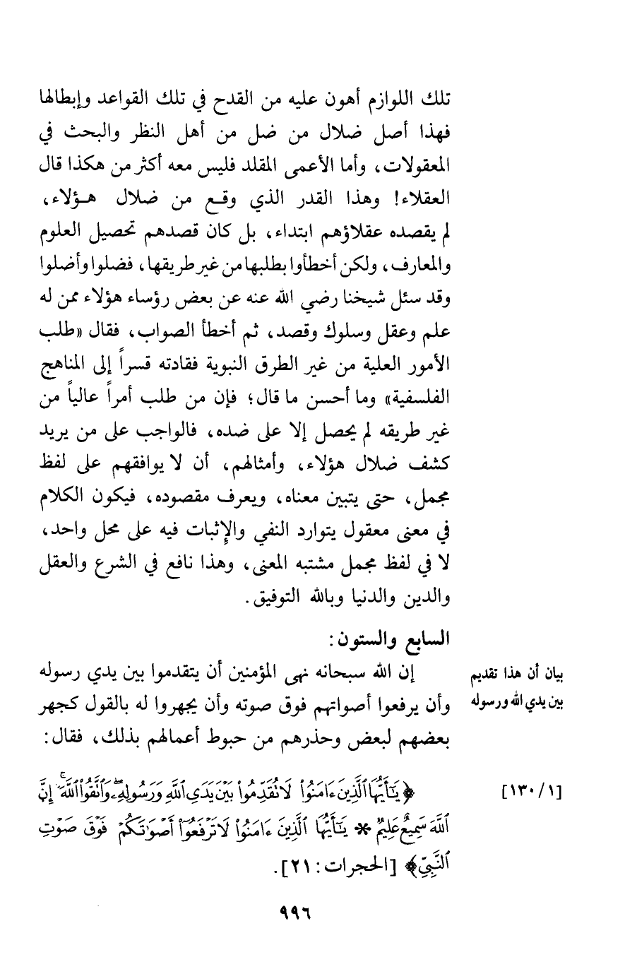 تلك اللوازم أهون عليه من القدح في تلك القواعد وإبطالها فهذا أصل ضلال من ضل من أهل النظر والبحث في المعقولات وأما الأعمى المقلد فليس معه أكثر من هكذا قال العقلاء وهذا القدر الذي وقع من ضلال هؤلاء لم يقصده عقلاؤهم ابتداء بل كان قصدهم تحصيل العلوم والمعارف ولكن أخطأوا بطلبها من غير طريقها فضلوا وأضلوا وقد سئل شيخنا رضي الله عنه عن بعض رؤساء هؤلاء ممن له علم وعقل وسلوك وقصد ثم أخطأ الصواب فقال طلب الأمور العلية من غير الطرق النبوية فقادته قسرا إلى المناهج الفلسفية وما أحسن ما قال فإن من طلب أمرا عاليا من غير طريقه لم يحصل إلا على ضده فالواجب على من يريد كشف ضلال هؤلاء وامثالهم أن لا يوافقهم على لفظ مجمل حتى يتبين معناه ويعرف مقصوده فيكون الكلام في معنى معقول يتوارد النفي والإثبات فيه على محل واحد لا في لفظ مجمل مشتبه المعنى وهذا نافع في الشرع والعقل والدين والدنيا وبالله التوفيق.