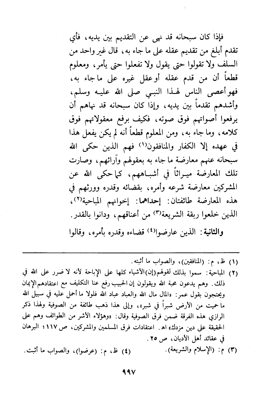 فإذا كان سبحانه قد نهى عن التقديم بين يديه فأي تقدم أبلغ من تقديم عقله على ما جاء به قال غير واحد من السلف ولا تقولوا حتى يقول ولا تفعلوا حتى يأمر ومعلوم قطعا أن من قدم عقله أو عقل غيره على ما جاء به فهو أعصى الناس لهذا النبي وأشدهم تقدما بين يديه وإذا كان سبحانه قد نهاهم أن يرفعوا أصواتهم فوق صوته فكيف برفع معقولاتهم فوق كلامه وما جاء به ومن المعلوم قطعا أنه لم يكن يفعل هذا في عهده إلا الكفار والمنافقون فهم الذين حكى الله سبحانه عنهم معارضة ما جاء به بعقولهم وآرائهم وصارت تلك المعارضة ميراثا في أشباههم كما حكى الله عن المشركين معارضة شرعه وأمره بقضائه وقدره وورثهم في هذه المعارضة طائفتان إحداهما إخوانهم المباحية الذين خلعوا ربقة الشريعة من أعناقهم ودانوا بالقدر.