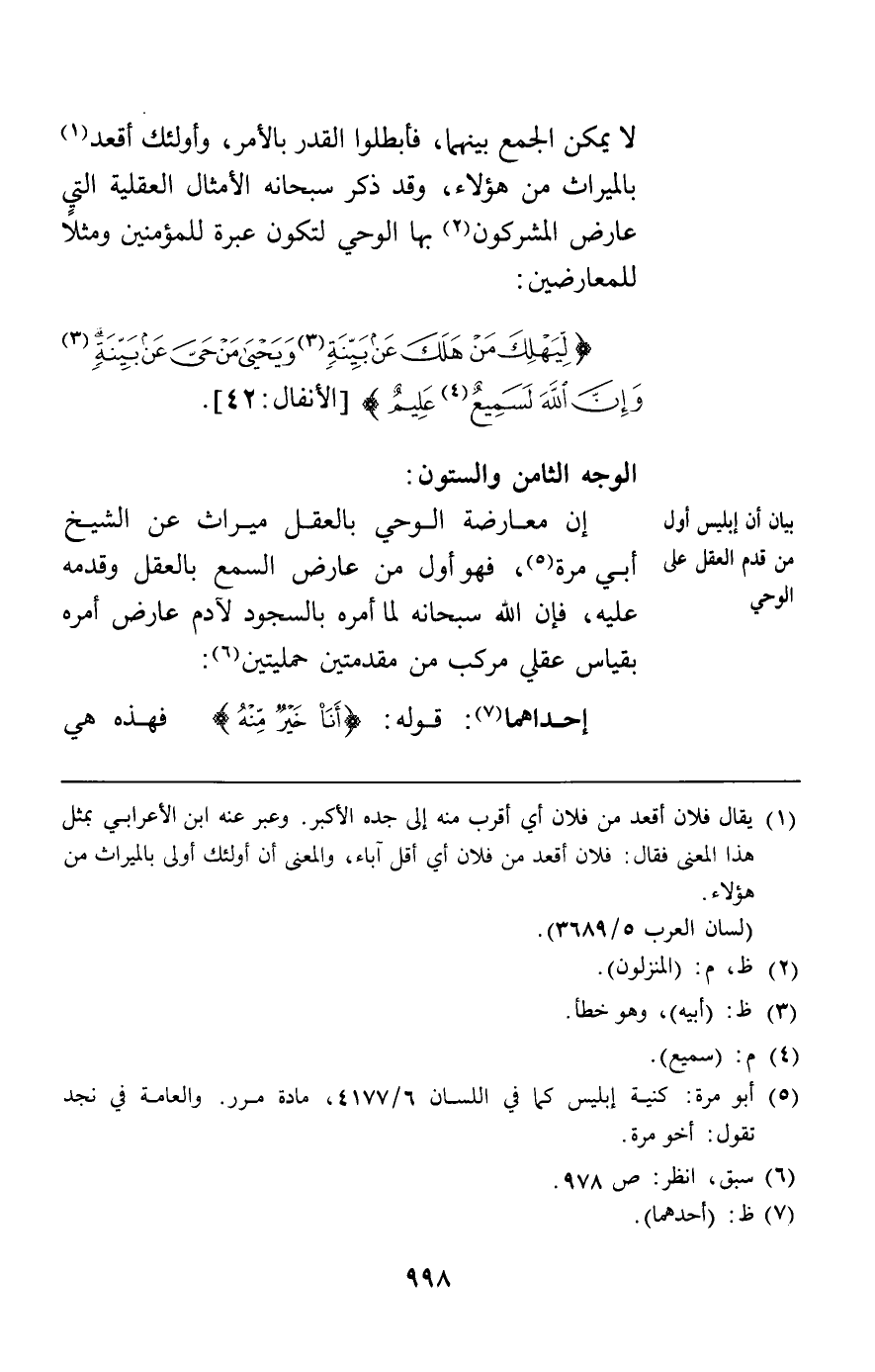 لا يمكن الجمع بينهما فأبطلوا القدر بالأمر وأولئك أقعد بالميراث من هؤلاء وقد ذكر سبحانه الأمثال العقلية التي عارض المشركون بها الوحي لتكون عبرة للمؤمنين ومثلا للمعارضين: {لِيَهْلِكَ مَنْ هَلَكَ عَنْ بَيِّنَةٍ وَيَحْيَى مَنْ حَيَّ عَنْ بَيِّنَةٍ وَإِنَّ اللَّهَ لَسَمِيعٌ عَلِيمٌ} [الأنفال42]