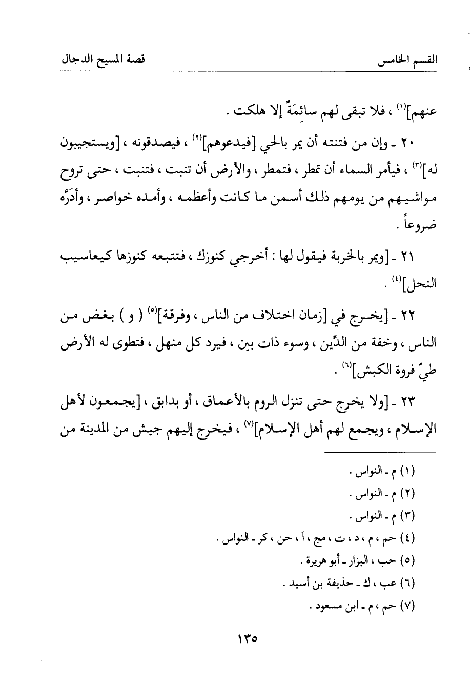 20 - وإن من فتنته أن يمر بالحي [فيدعوهم] فيصدقونه [ويستجيبون له] فيأمر السماء أن تمطر فتمطر والأرض أن تنبت فتنبت حتى تروح مواشيهم من يومهم ذلك أسمن ما كانت وأعظمه وأمده خواصر وأدره ضروعا