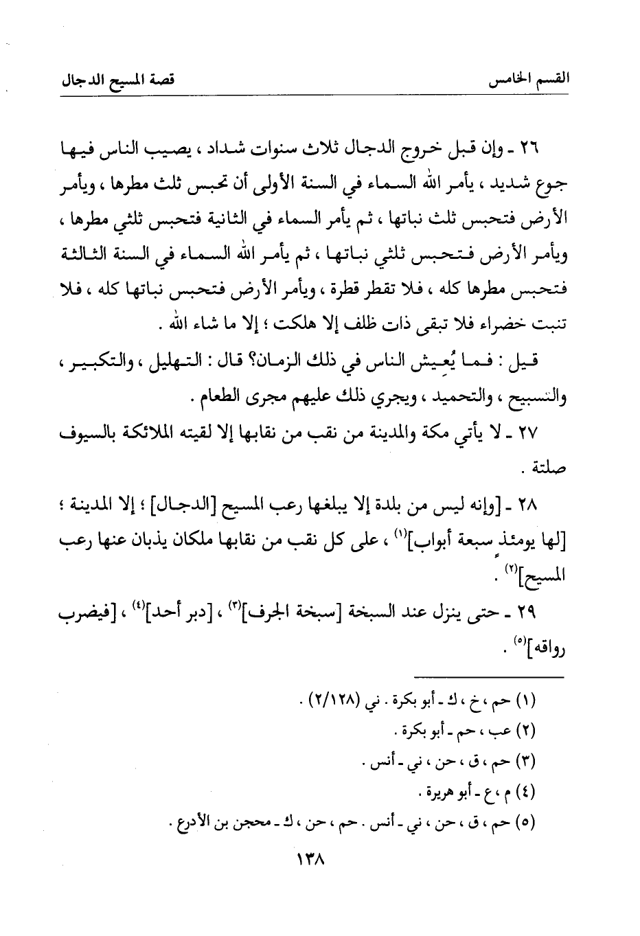 28 - [وإنه ليس من بلدة إلا يبلغها رعب المسيح [الدجال] إلا المدينة [لها يومئذ سبعة أبواب] على كل نقب من نقابها ملكان يذبان عنها رعب المسيح]