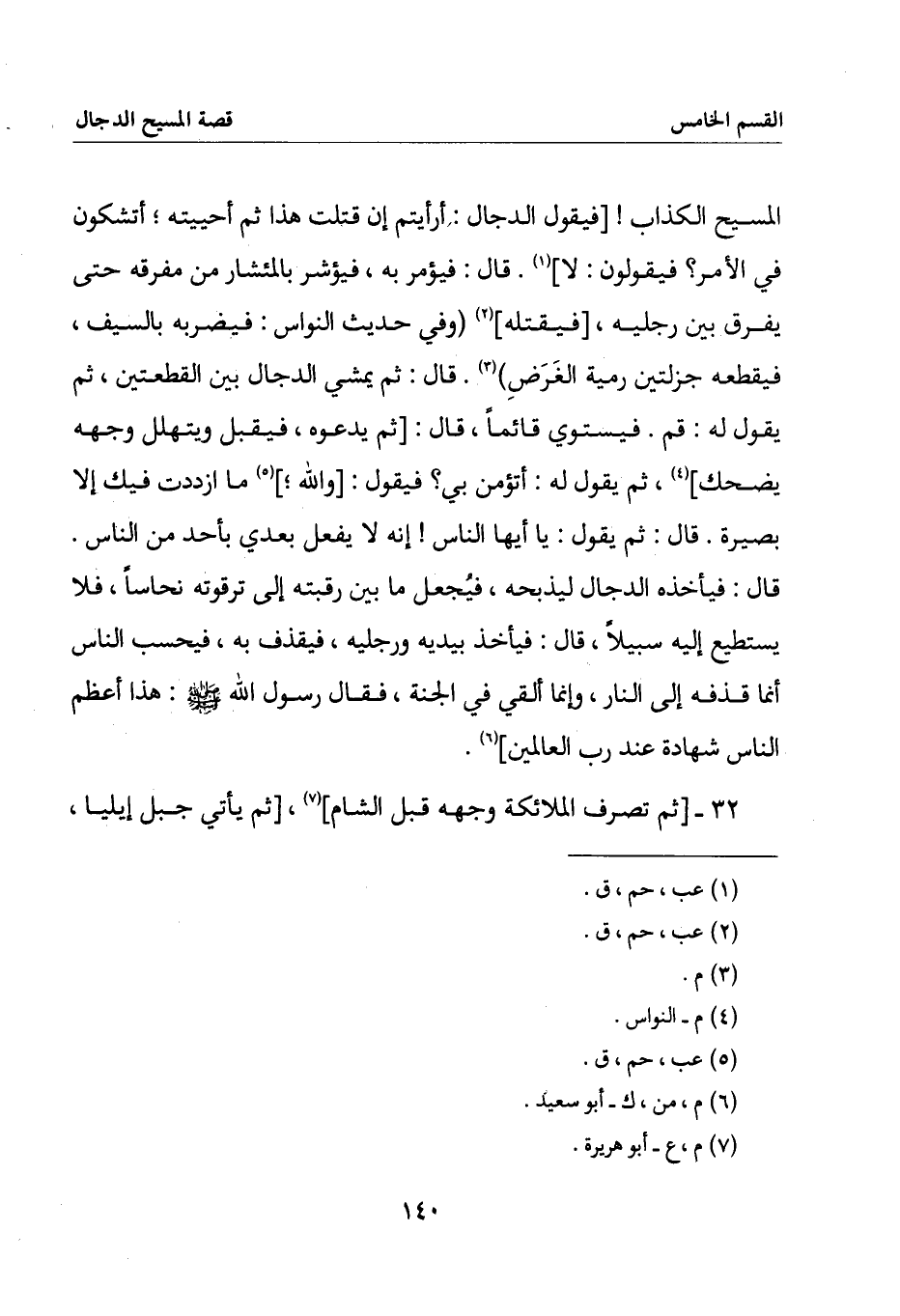 المسيح الكذاب [فيقول الدجال: أرأيتم إن قتلت هذا ثم أحييته أتشكون في الأمر؟ فيقولون: لا]. قال: فيؤمر به فيؤشر المئشار من مفرقه حتى يفرق بين رجليه [فيقتله] (وفي حديث النواس: فيضربه بالسيف فيقطعه جزلتين رمية الغرض). قال: ثم يمشي الدجال بين القطعتين ثم يقول له: قم. فيستوي قائما قال: [ثم يدعوه فيقبل ويتهلل وجهه ويضحك] ثم يقول له: أتؤمن بي؟ فيقول: [والله] ما ازددت فيك إلا بصيرة. قال: ثم يقول: يا أيها الناس إنه لا يفعل بعدي بأحد من الناس. قال: فيأخذه الدجال ليذبحه فيجعل ما بين رقبته إلى ترقوته نحاسا فلا يستطيع إليه سبيلا قال: فيأخذ بيديه ورجليه فيقذف به فيحسب الناس أنما قذفه إلى النار وإنما ألقي في الجنة فقال رسول الله A: هذا أعظم الناس شهادة عند رب العالمين]
