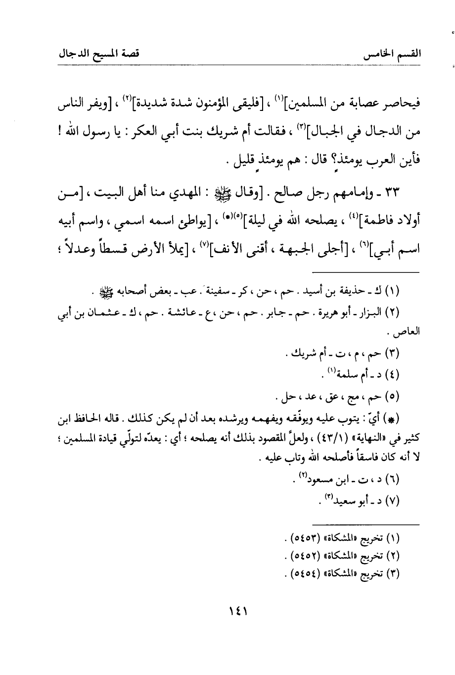 33 - وإمامهم رجل صالح [وقال A: المهدي منا آل البيت [من أولاد فاطمة] يصلحه الله في ليلة] [يواطئ اسمه اسمي واسم أبيه اسم أبي] [أجلى الجبهة أقنى الأنف] [يملأ الأرض قسطا وعدلا